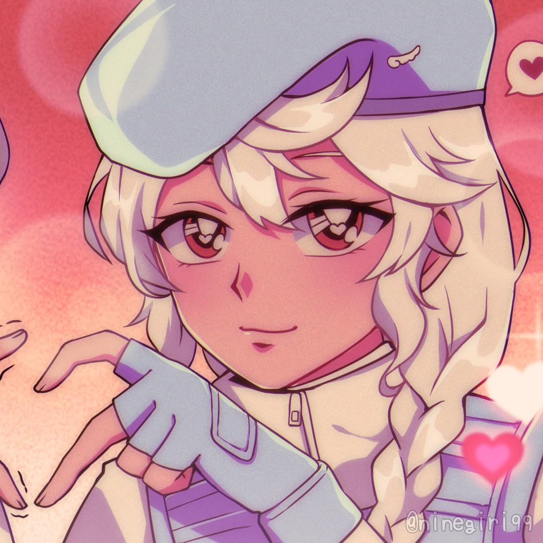 1girl blue_gloves blue_hat braid commentary english_commentary fingerless_gloves gloves half-heart_hands hat heart heart-shaped_pupils kanna_(love-bullet) looking_at_viewer love-bullet ninegiri portrait red_eyes smile solo spoken_heart symbol-shaped_pupils twitter_username white_hair