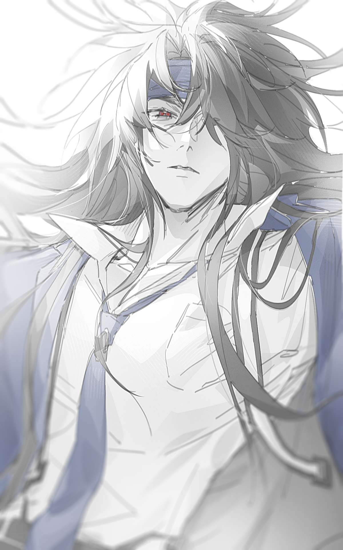 1boy alternate_color black_hair blue_headband blue_jacket blue_necktie collared_shirt final_fantasy final_fantasy_vii final_fantasy_vii:_ever_crisis hair_between_eyes headband highres jacket lily_(shio1006) long_hair male_focus messy_hair necktie official_alternate_costume parted_lips popped_collar red_eyes shirt solo suspenders tie_clip upper_body vincent_valentine vincent_valentine_(formal_attire) white_background white_shirt