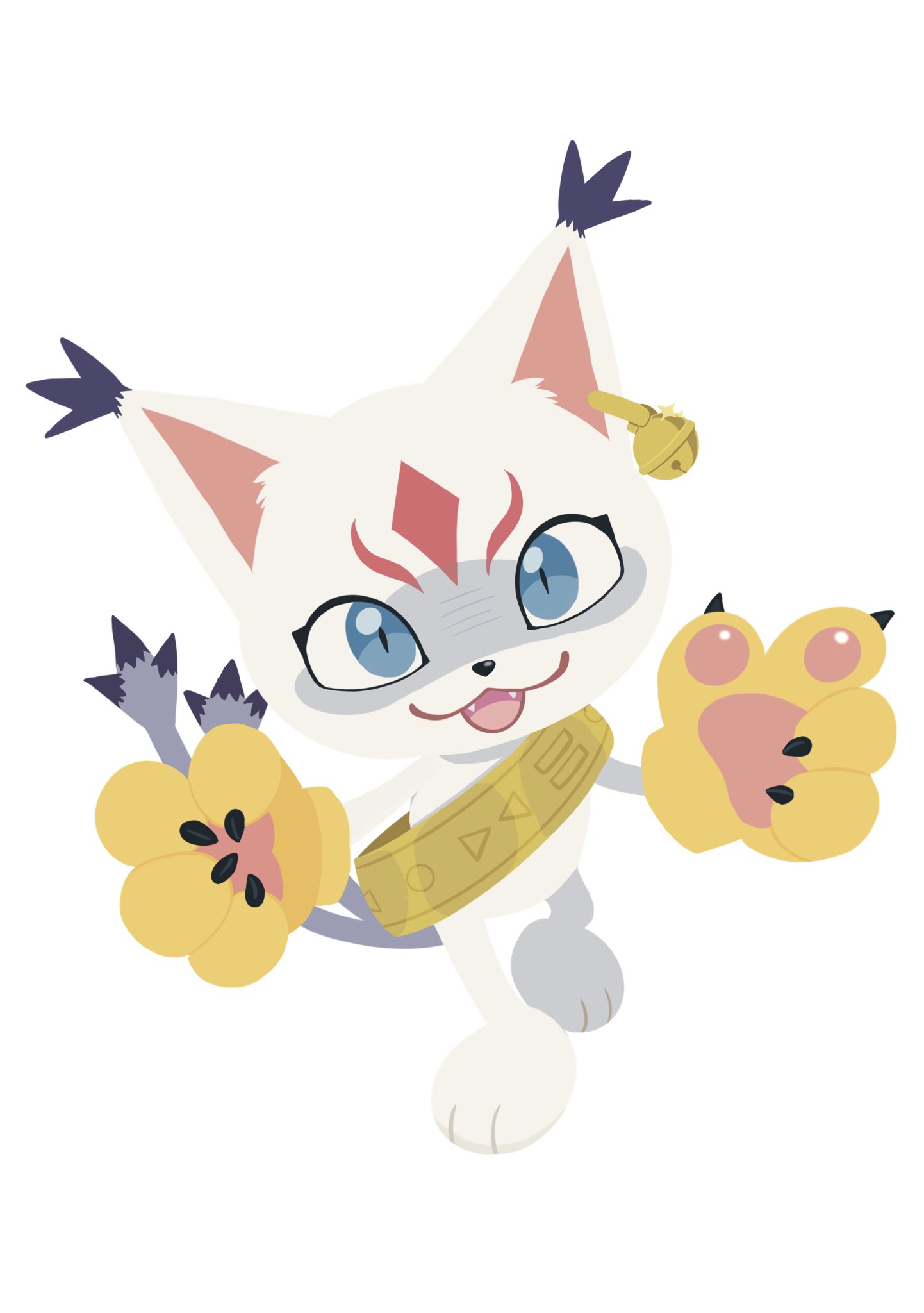 :3 animal_ear_piercing animal_ears animal_hands animal_nose bell bell_piercing blue_eyes cat_ears cat_paws claws creature creature_focus digimoji digimon digimon_(creature) donutprty facial_mark fangs forehead_mark full_body gloves highres holy_ring jingle_bell looking_at_viewer multiple_tails open_mouth paw_gloves sash shoulder_sash simple_background slit_pupils smile standing tail tailmon_x-antibody two_tails white_background white_fur yellow_gloves