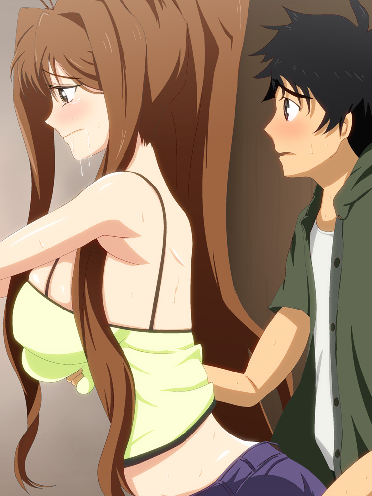 10s 1boy 1girl black_hair blush breasts brown_hair cousins dragon_crisis! drooling grabbing_another's_breast groping hetero incest kisaragi_ryuuji large_breasts long_hair nanao_eriko saliva tagme tsubooi