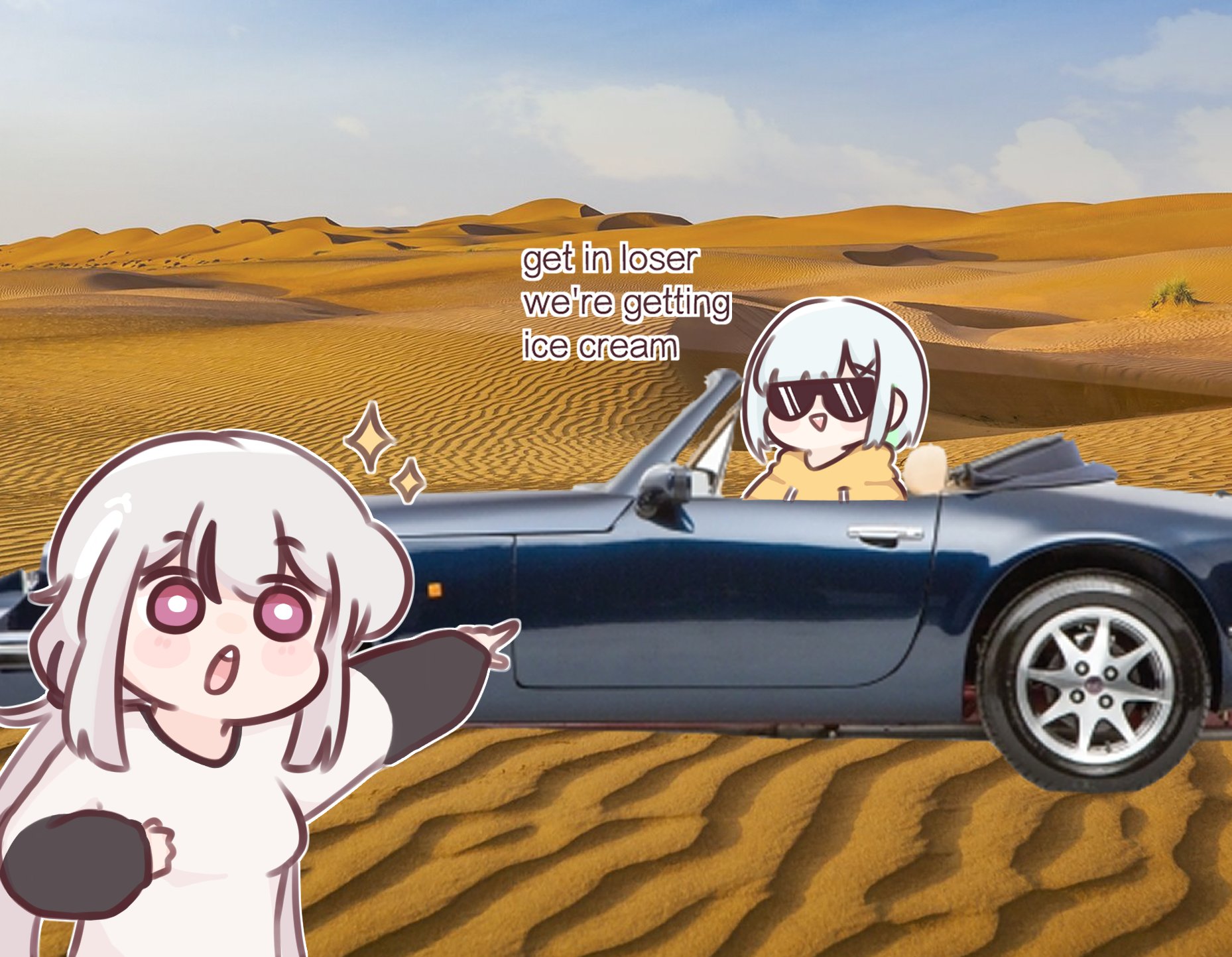 2girls :> :o artist_self-insert black_shirt blue_hair blue_sky blush_stickers breasts bush car chibi chibi_only chonkyorca cloud cloudy_sky commentary convertible day desert drawstring english_commentary english_text eyebrows female_focus grey_hair hair_between_eyes hair_ornament highres hood hood_down hoodie horizon layered_sleeves long_hair long_sleeves looking_at_another looking_at_viewer low_twintails medium_breasts meme motor_vehicle multicolored_hair multiple_girls open_mouth orca_(chonkyorca) original outdoors outstretched_arm photo_background photo_inset pointing pointing_at_another puffy_long_sleeves puffy_sleeves purple_eyes sand sand_dune shirt short_hair short_over_long_sleeves short_sleeves sidelocks sitting sky small_breasts sparkle standing streaked_hair sunglasses teeth triangle_mouth twintails two_soyjaks_pointing_(meme) upper_body upper_teeth_only vehicle_interior white_hair white_shirt wide-eyed x_hair_ornament yellow_hoodie