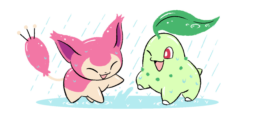 2others animal animal_focus big_head chikorita gen_2_pokemon gen_3_pokemon gotchibam happy leaf multiple_others nintendo no_humans one_eye_closed open_mouth playing pokemon pokemon_(creature) puddle rain red_eyes skitty