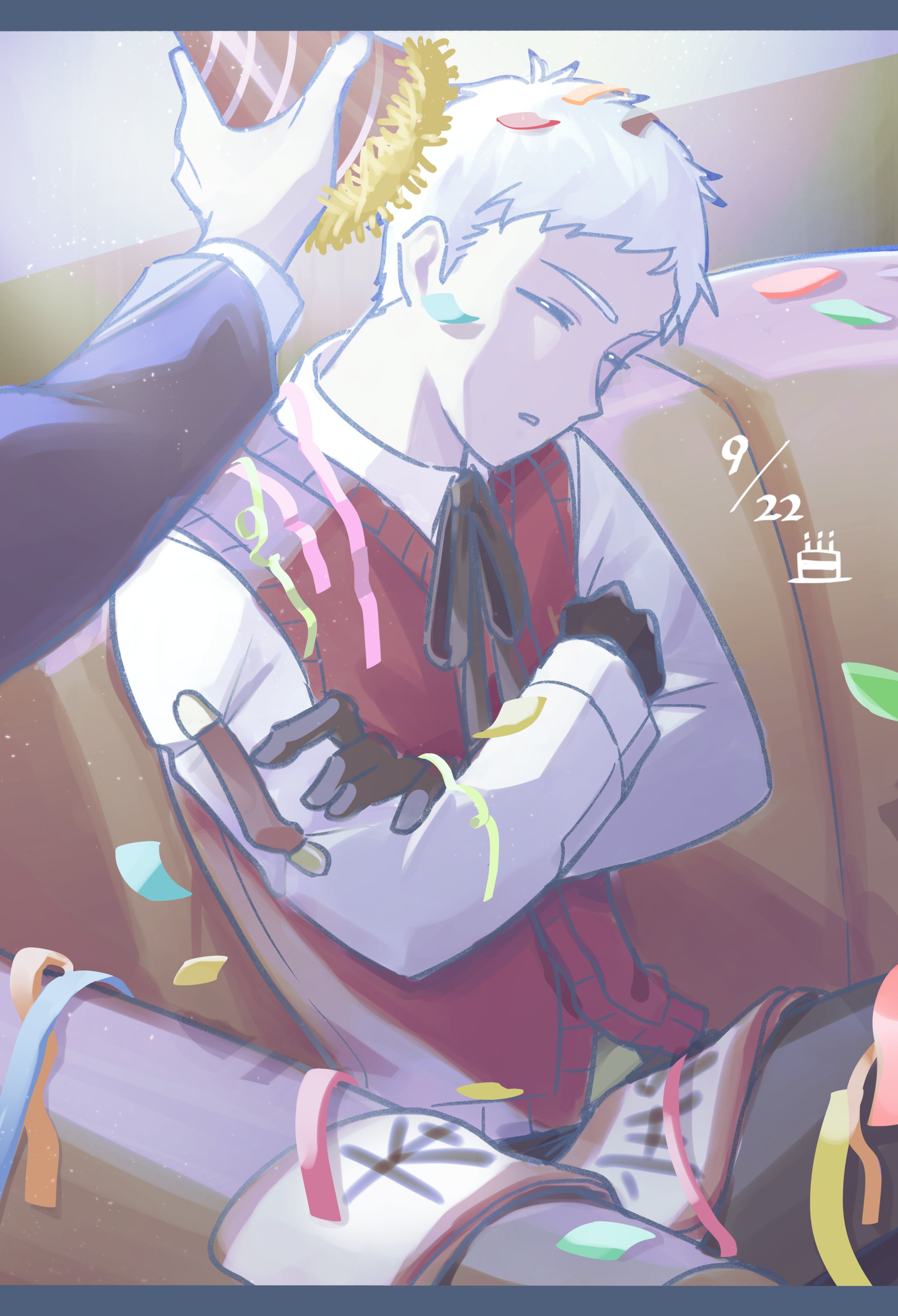 2boys absurdres birthday black_gloves black_jacket black_pants black_ribbon closed_eyes collared_shirt commentary confetti couch crossed_arms dated gloves grey_hair hat highres holding indoors jacket long_sleeves male_focus multiple_boys neck_ribbon pants parted_lips party_hat persona persona_3 po_su_su red_sweater_vest ribbon sanada_akihiko shirt short_hair sitting sleeping sweater_vest untranslatable_commentary white_shirt yuuki_makoto_(persona_3)