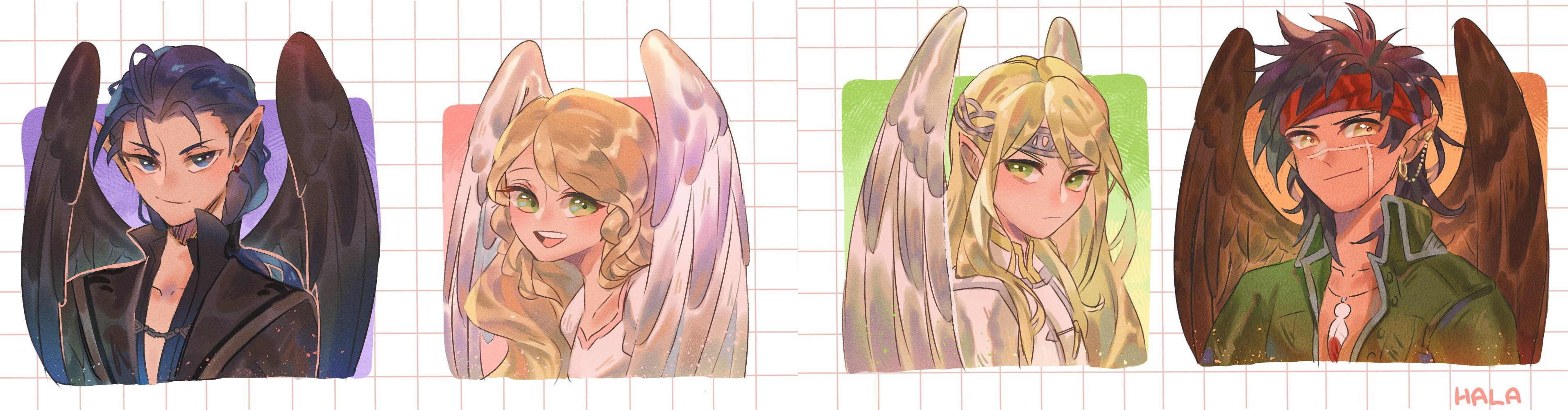 1girl 3boys :d absurdres artist_name bird_boy bird_girl black_coat black_wings blonde_hair blue_eyes blue_hair blush brown_eyes brown_hair brown_wings closed_mouth coat commentary ear_piercing earrings ears english_commentary feather_necklace feathers fire_emblem fire_emblem:_path_of_radiance fire_emblem:_radiant_dawn green_coat green_eyes grid_background halapokok headband highres jewelry leanne_(fire_emblem) long_hair medium_hair multiple_boys naesala_(fire_emblem) necklace nintendo open_mouth photoshop_(medium) piercing pointy_ears red_headband reyson_(fire_emblem) robe scar scar_on_face serious simple_background smile teeth third-party_edit tibarn_(fire_emblem) upper_teeth_only very_long_hair white_background white_coat white_robe white_wings wings yellow_eyes