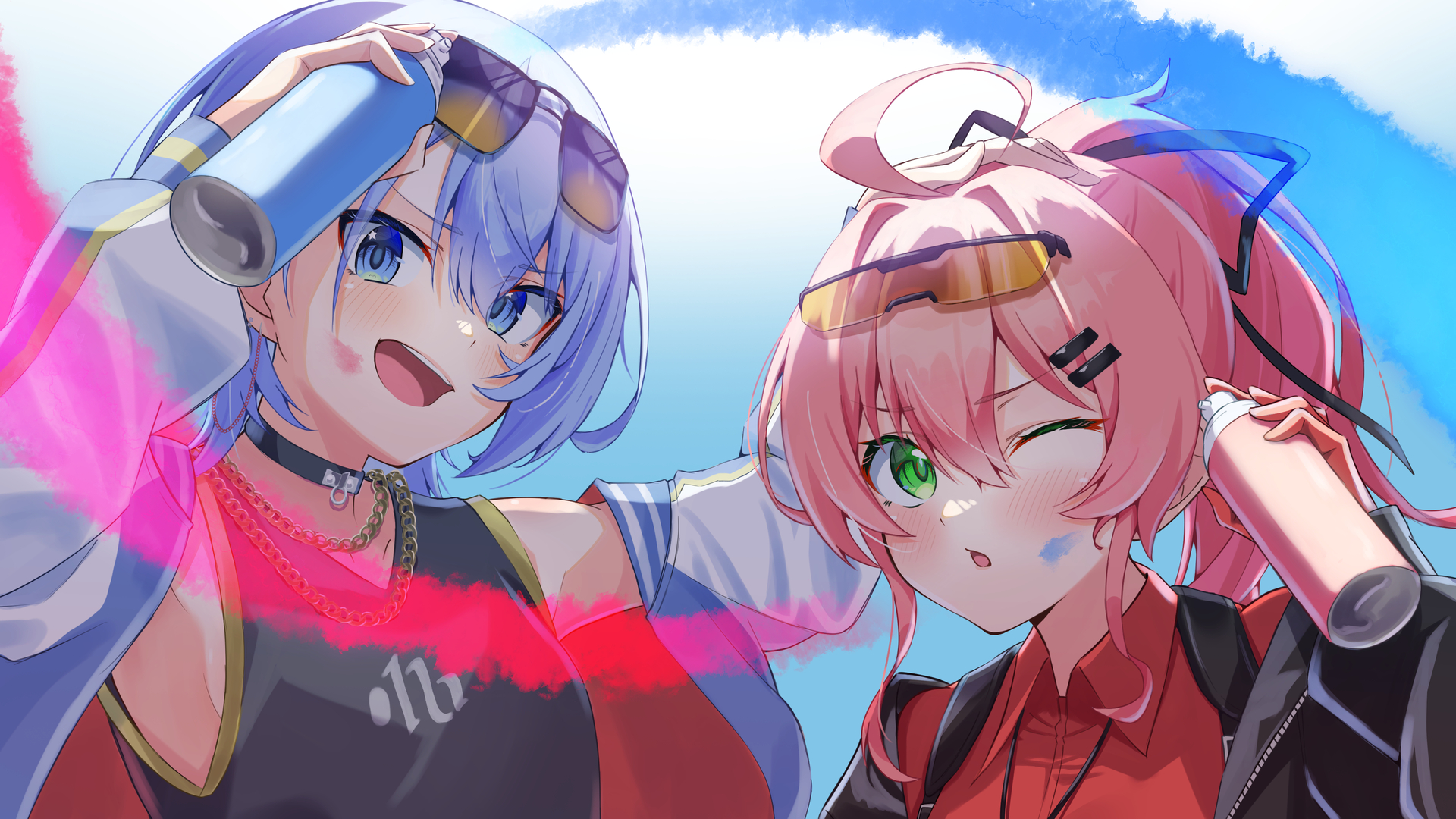 ahoge blue_eyes blue_hair green_eyes highres hololive hoshimachi_suisei kamkampan pink_hair ponytail sakura_miko spray_can star_(symbol) star_in_eye sunglasses symbol_in_eye virtual_youtuber