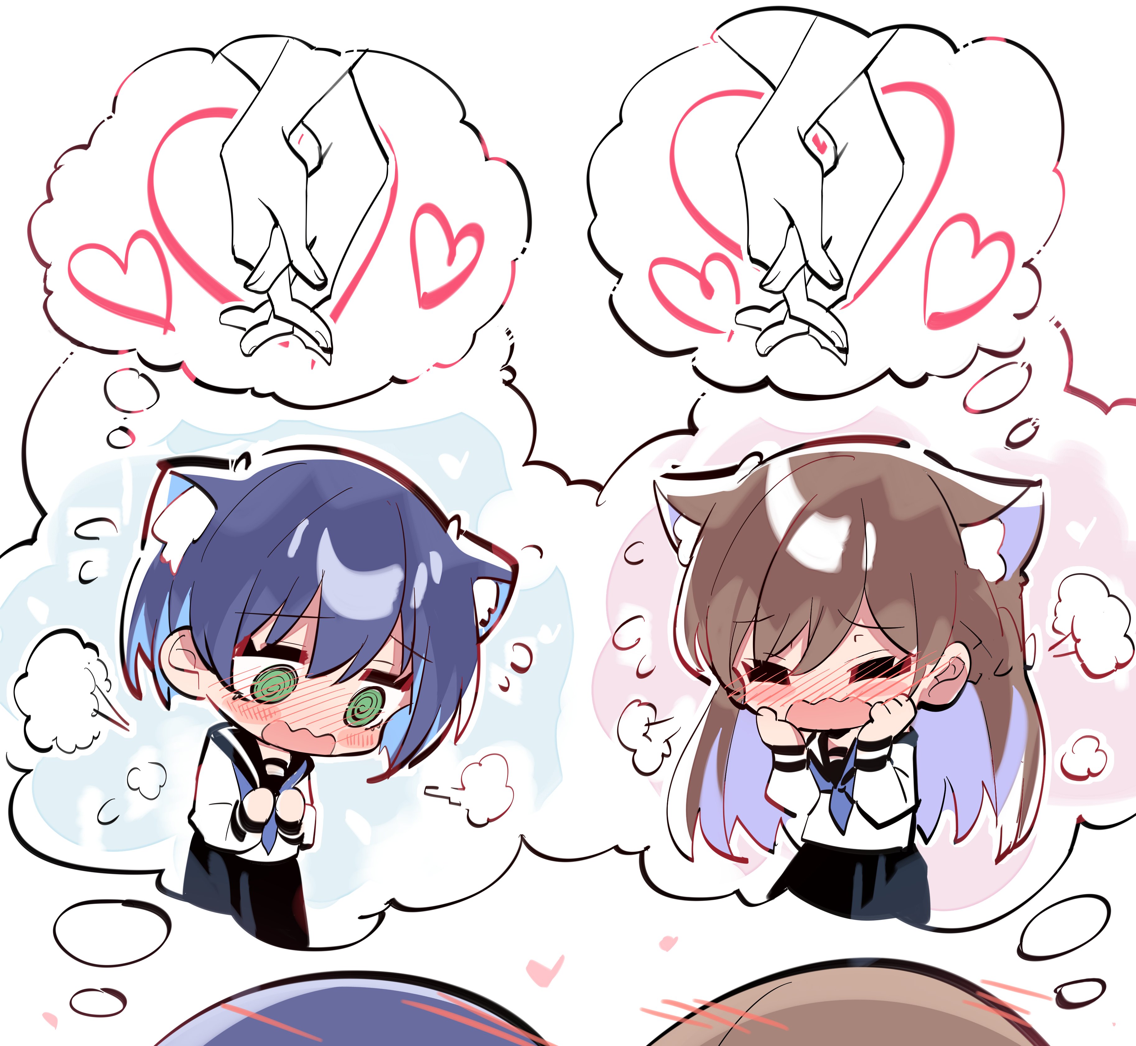 2girls @_@ absurdres animal_ear_fluff animal_ears another_ship_dynamic_i_enjoy_(meme) black_sailor_collar black_skirt blue_hair blue_neckerchief blush brown_hair cat_ears cat_girl chibi closed_eyes colored_inner_hair commentary embarrassed green_eyes hands_on_own_cheeks hands_on_own_face heart highres holding_hands imagining interlocked_fingers kemonomimi_mode long_hair long_sleeves meme multicolored_hair multiple_girls na_nare_hana_nare neckerchief obunai_suzuha open_mouth puff_of_air sailor_collar shirt short_hair simple_background skirt speech_bubble untranslatable_commentary tanizaki_shion thought_bubble white_background white_shirt yuri zhanzhangzlw