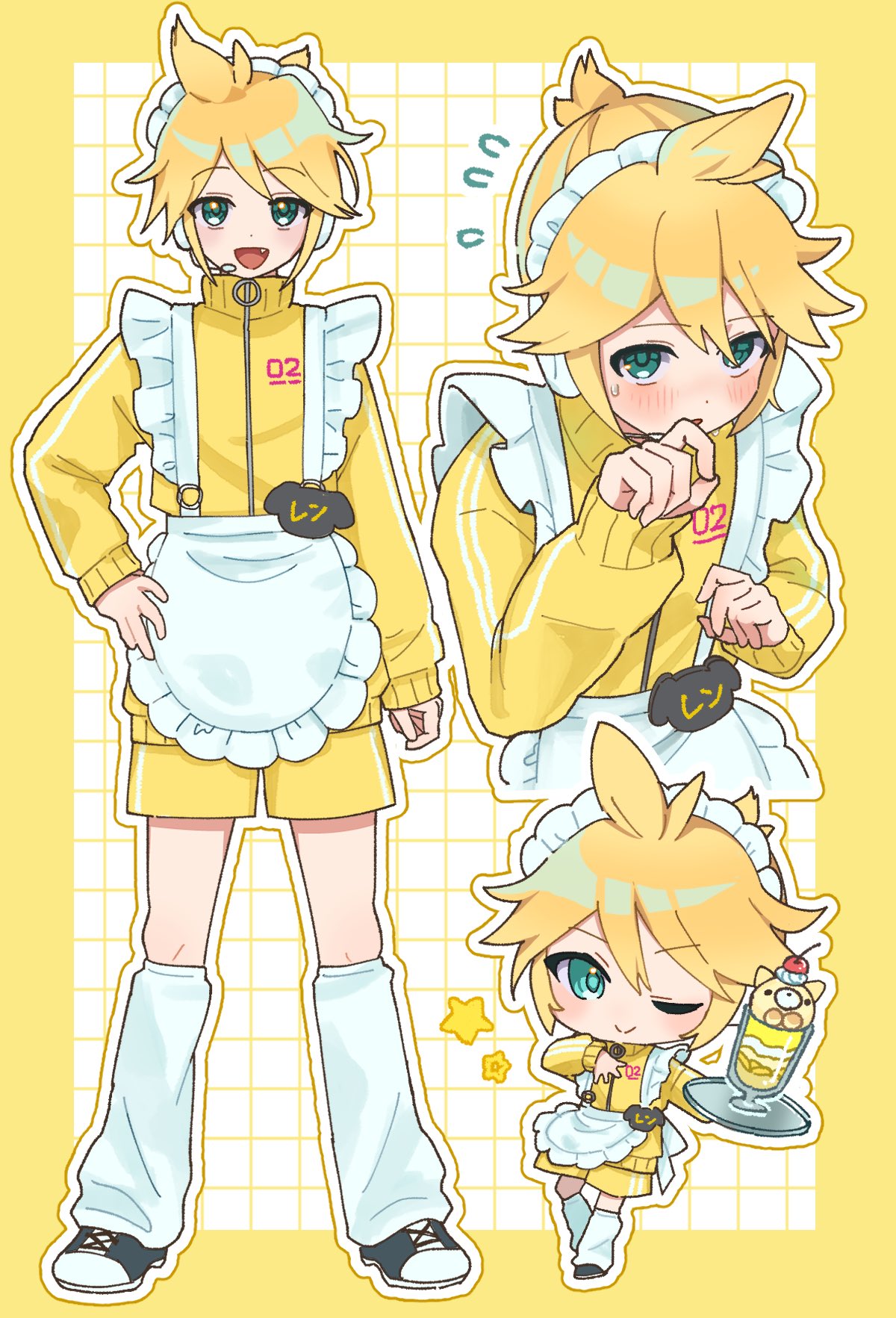 1boy alternate_costume apron aqua_eyes blonde_hair blush border chibi chibi_inset closed_mouth commentary crossdressing crossdressing_(mtf) flying_sweatdrops food frilled_apron frills full_body grid_background hand_on_own_hip hand_up hidaka_ui highres holding holding_tray ice_cream ice_cream_float jacket jersey_maid kagamine_len leg_warmers long_sleeves looking_at_viewer maid maid_apron maid_headdress male_maid multiple_views one_eye_closed outline outside_border parted_lips shoes short_hair shorts smile sneakers standing star_(symbol) straight-on track_jacket tray unconventional_maid upper_body vocaloid waist_apron white_apron white_background white_leg_warmers yellow_border yellow_jacket yellow_shorts zipper_pull_tab