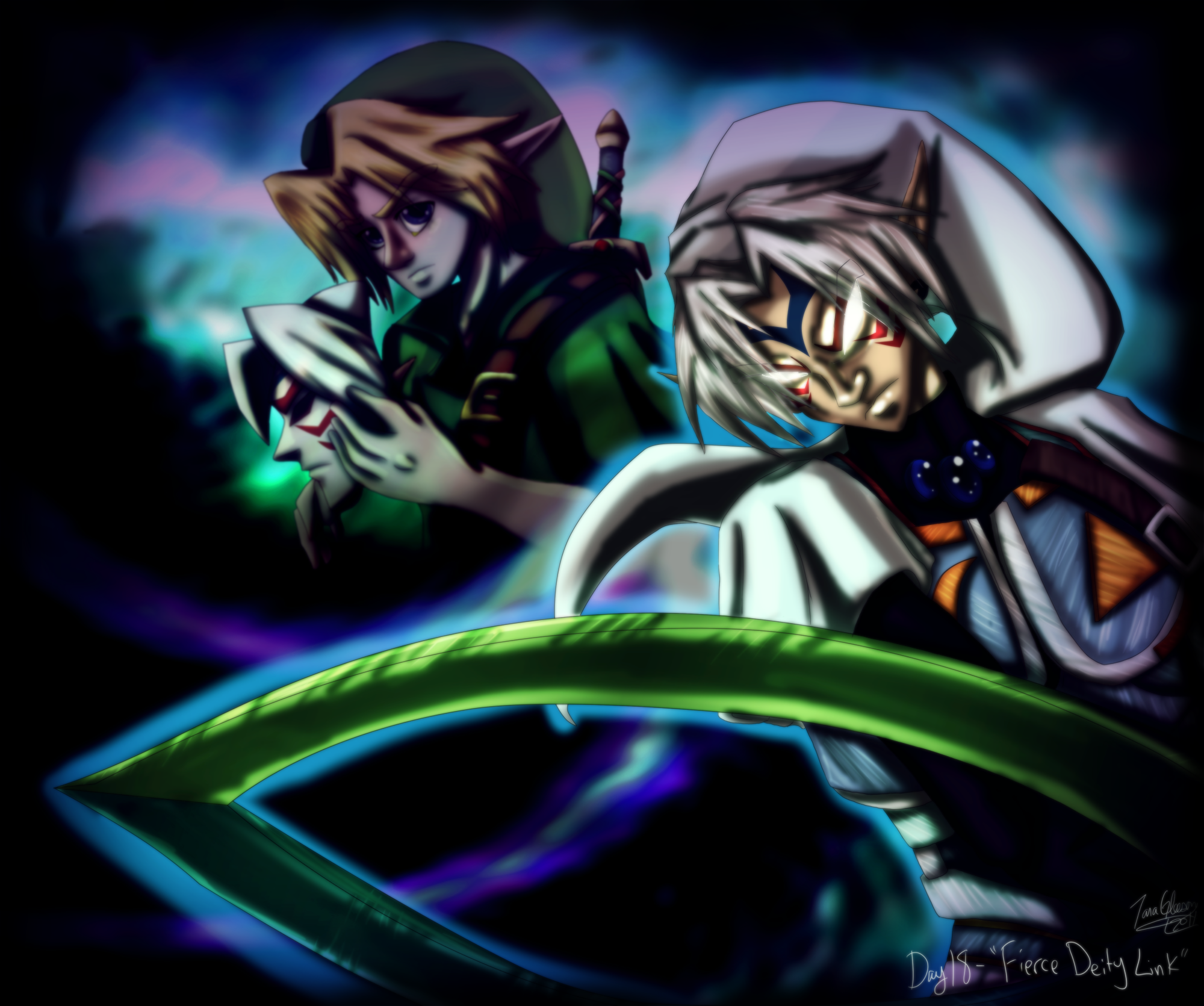 2boys alternate_costume anniversary aura before_and_after belt belt_buckle black_eyes blonde_hair blue_gem buckle celtic_magician chest_jewel commentary crescent crescent_print double_helix dual_persona english_commentary facial_mark facial_tattoo fierce_deity frown fusion gem glowing glowing_eyes green_hat hat highres holding holding_mask link mask multiple_boys nintendo no_pupils official_alternate_costume pointy_ears possessed possession short_hair short_sleeves sword tattoo the_legend_of_zelda the_legend_of_zelda:_majora's_mask transformation triangle triangle_print weapon white_eyes white_hair young_link