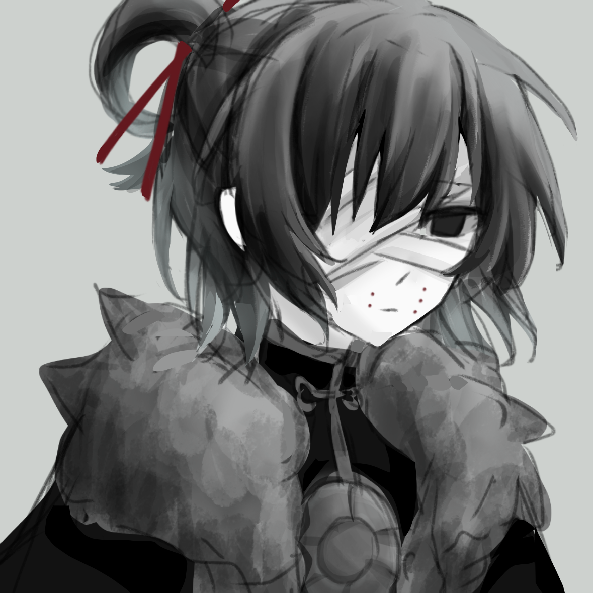 1girl bandage_over_one_eye chinese_commentary closed_mouth commentary_request expressionless facial_mark fur-trimmed_jacket fur_trim grey_background greyscale hair_ornament hair_rings hair_stick jacket mofa_maomao monochrome open_clothes open_jacket portrait short_hair simple_background single_hair_ring sketch solo spot_color touqi_guaitan wu_song_(female)_(touqi_guaitan)