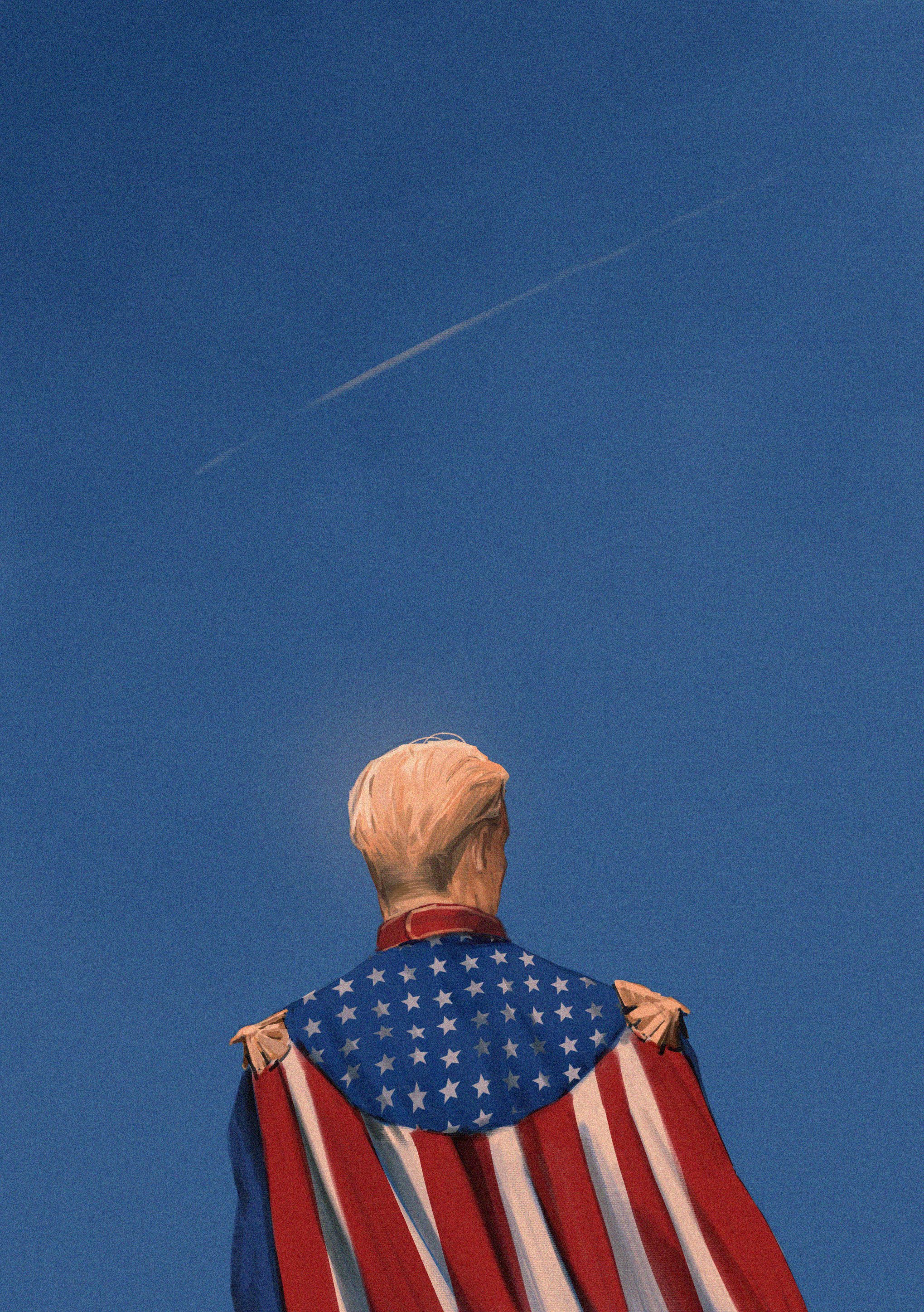 1boy absurdres american_flag blonde_hair blue_sky cape commentary contrail english_commentary film_grain from_behind hair_slicked_back highres homelander looking_to_the_side male_focus sky solo superhero_costume the_boys upper_body vanshoundd