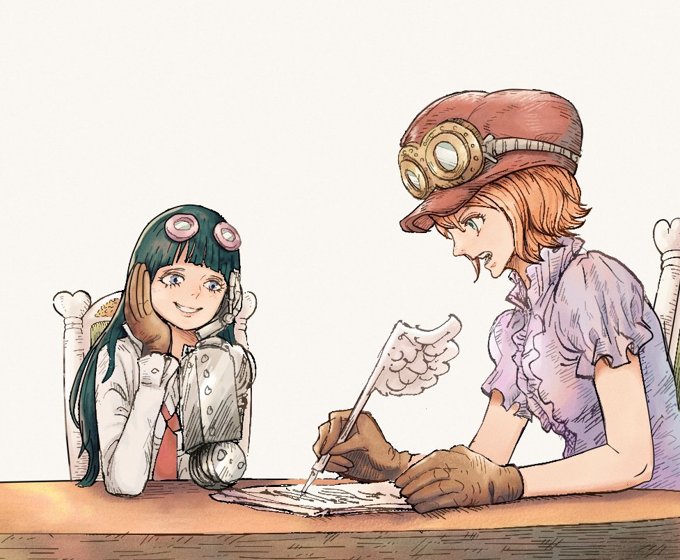 1boy 1girl ahiru_(one_piece) akagmiop black_hair blunt_bangs brown_gloves commentary gloves goggles goggles_on_head goggles_on_headwear holding holding_pen koala_(one_piece) long_hair long_sleeves mechanical_arms necktie one_piece pen pink_shirt profile red_necktie shirt short_hair short_sleeves simple_background single_mechanical_arm smile white_shirt