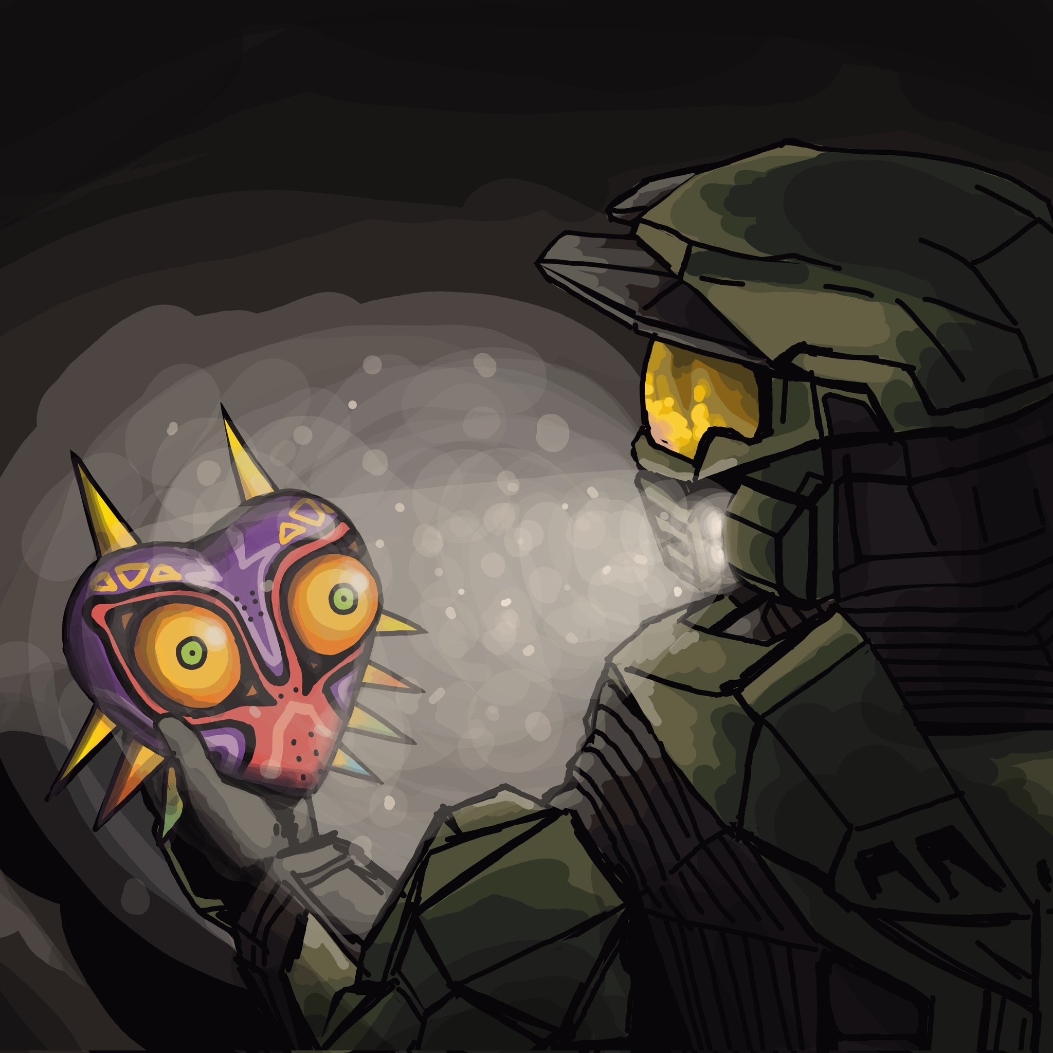 assault_visor black_gloves commentary crossover english_commentary gloves green_helmet halo:_combat_evolved halo_(series) helmet highres holding holding_mask jj_rabbid looking_down majora_(zelda) mask master_chief nintendo spartan_(halo) the_legend_of_zelda the_legend_of_zelda:_majora's_mask