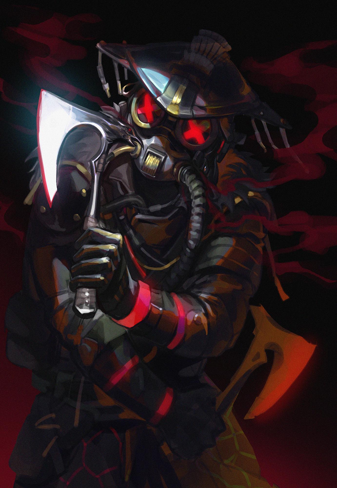 1other ambiguous_gender apex_legends axe black_background black_gloves black_jacket bloodhound_(apex_legends) dual_wielding fur-trimmed_jacket fur_trim gloves head_tilt helmet highres holding holding_axe jacket korean_commentary leaning_to_the_side nolm_(sagl8d) other_focus raven's_bite rebreather smoke solo x_x