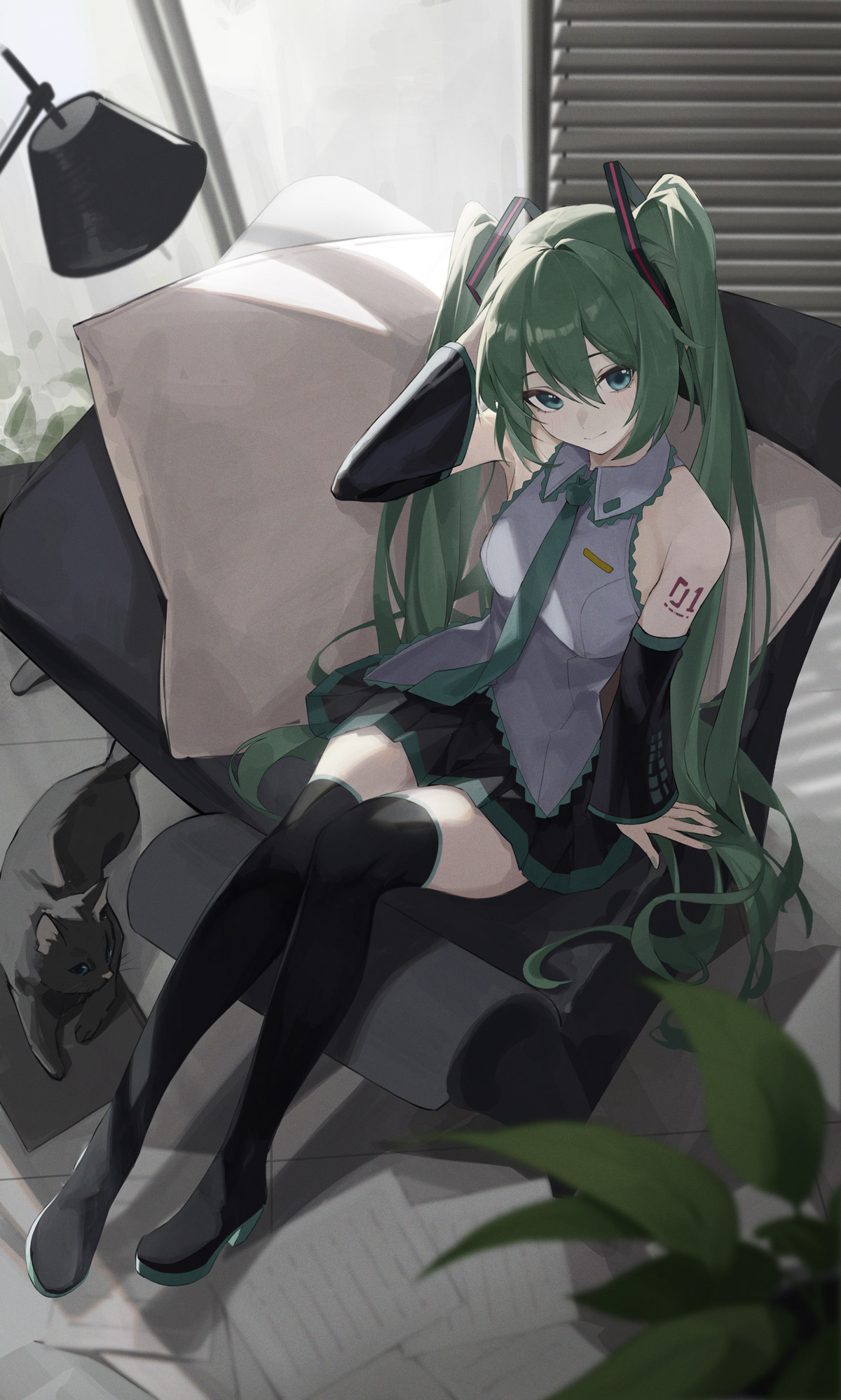 1girl aqua_eyes arm_support arm_up backlighting black_cat black_footwear black_skirt black_sleeves blurry boots cat collared_shirt commentary_request day detached_sleeves frilled_shirt frills from_above green_hair green_nails green_necktie green_trim grey_shirt hair_ornament hatsune_miku highres indoors light_blush long_hair looking_at_viewer nail_polish necktie number_tattoo pillow plant shirt shoulder_tattoo sitting skirt sleeveless sleeveless_shirt smile sunlight tattoo thigh_boots twintails very_long_hair vocaloid wall_lamp window_shadow xuegao_ice