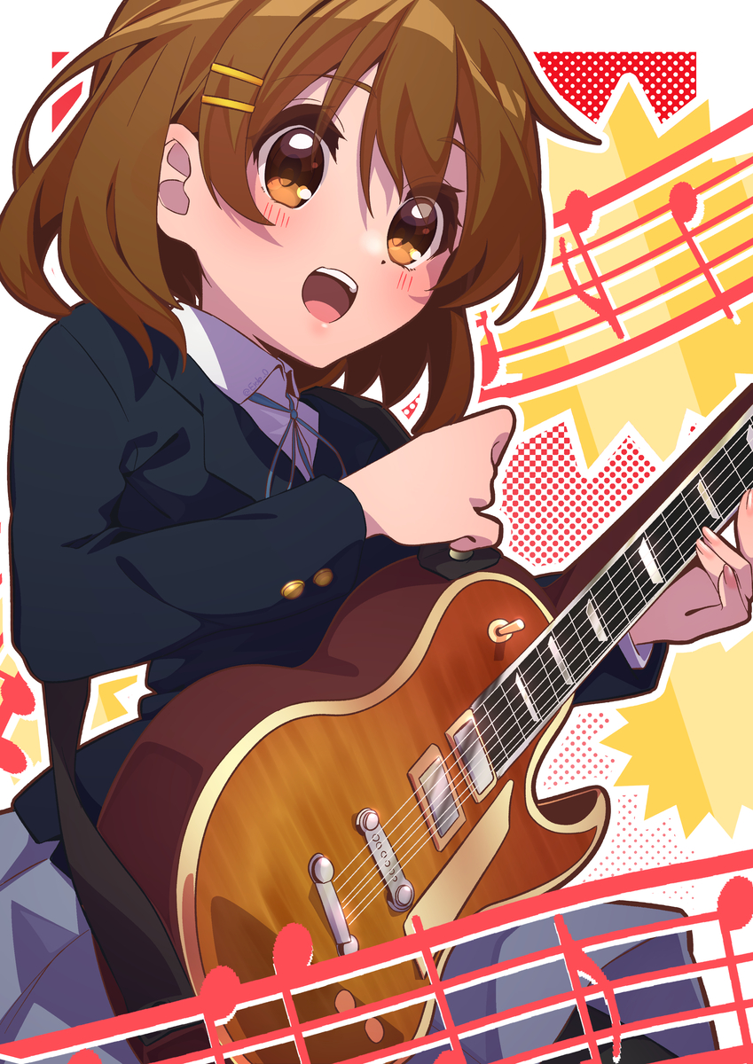 1girl brown_eyes brown_hair dot_nose erde_0 female_focus guitar hair_ornament hairclip highres hirasawa_yui holding holding_guitar holding_instrument instrument k-on! long_sleeves looking_at_viewer musical_note open_mouth sakuragaoka_high_school_uniform school_uniform short_hair solo standing