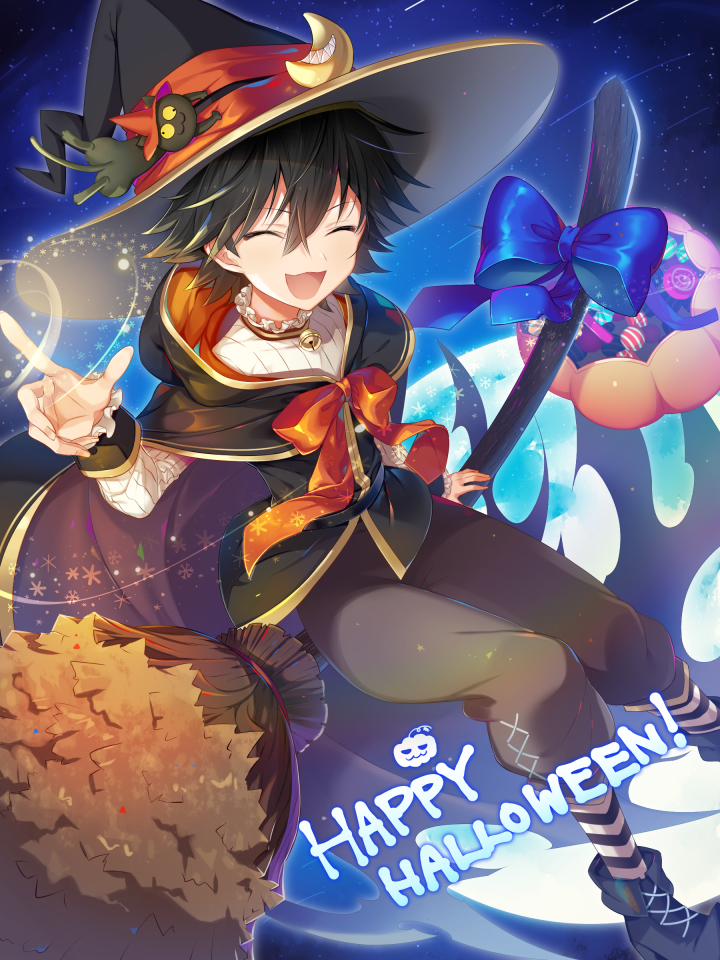 1boy bell black_footwear black_hair blue_bow bow broom broom_riding bungou_stray_dogs candy cape cat_hat_ornament closed_eyes commentary_request crescent crescent_hat_ornament edogawa_ranpo_(bungou_stray_dogs) food hair_between_eyes halloween halloween_bucket halloween_costume happy_halloween hat hat_ornament hood hood_down index_finger_raised jack-o'-lantern jingle_bell kakaoken long_sleeves male_focus moon neck_bell official_alternate_costume open_mouth pants partial_commentary pumpkin ribbon shirt shooting_star short_hair sidesaddle sitting smile socks solo star_(sky) striped_clothes striped_socks white_shirt witch_hat