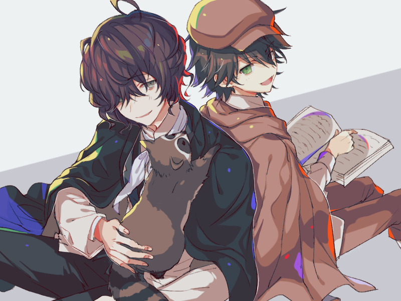 2boys ahoge animal back-to-back black_hair black_pants book brown_hair brown_hat brown_jacket brown_pants bungou_stray_dogs commentary_request edgar_allan_poe_(bungou_stray_dogs) edogawa_ranpo_(bungou_stray_dogs) green_eyes grey_eyes hair_between_eyes hair_over_one_eye hat holding holding_book hood hood_down jacket jacket_on_shoulders kakaoken long_sleeves male_focus multiple_boys neckerchief open_mouth pants partial_commentary raccoon shirt short_hair sitting white_neckerchief white_shirt