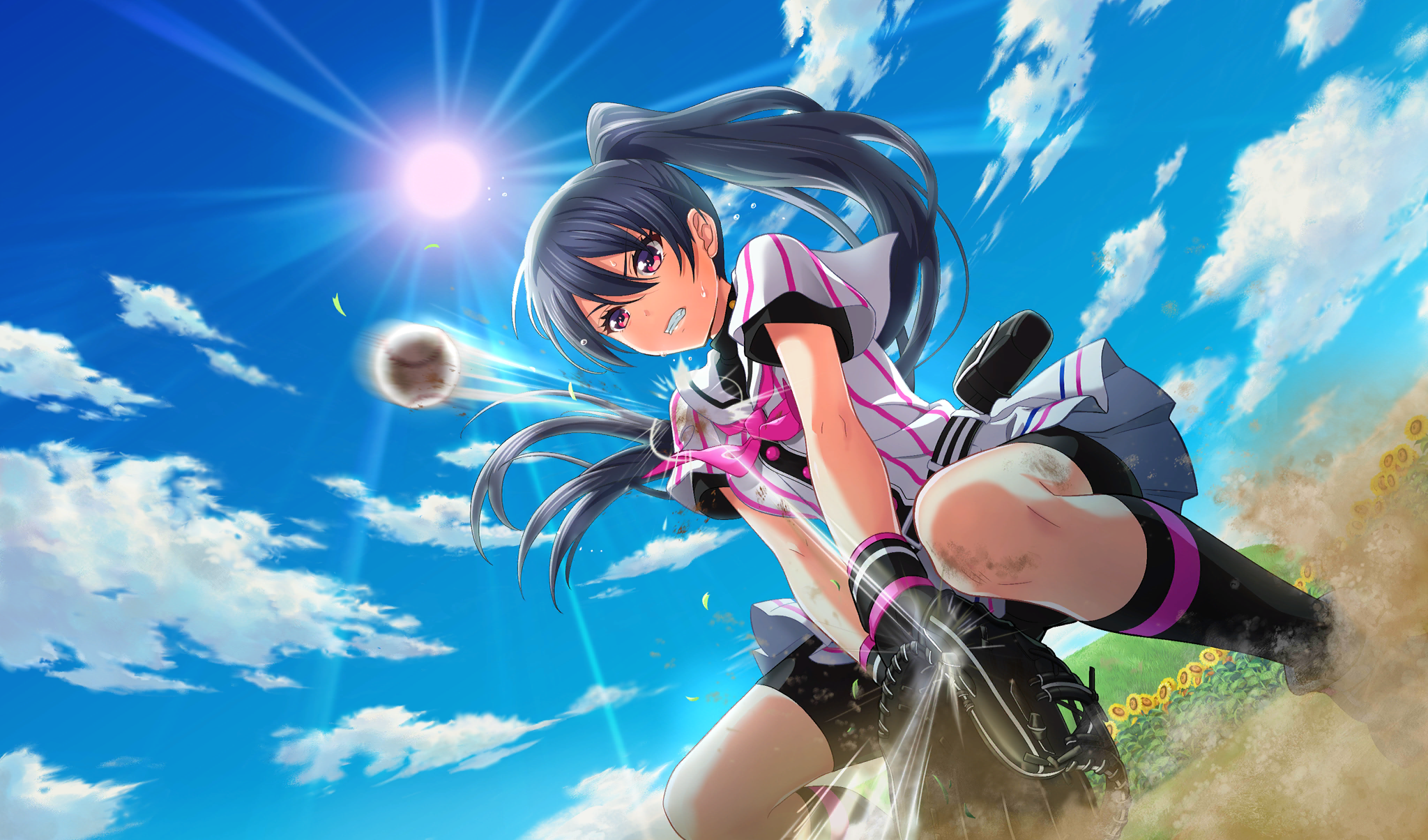 1girl ball baseball baseball_(object) baseball_field baseball_glove baseball_uniform belt belt_buckle belt_pouch bike_shorts bike_shorts_under_skirt black_belt black_footwear black_gloves black_hair black_shorts black_socks buckle catching cinderella_series clenched_teeth cloud dutch_angle falling_leaves field fingerless_gloves fisheye flower flower_field game_cg gloves hachigatsu_no_cinderella_nine hair_between_eyes high_ponytail highres leaf long_hair looking_at_object motion_blur motion_lines neckerchief non-web_source official_alternate_hairstyle official_art outdoors pink_neckerchief playing_sports pleated_skirt ponytail pouch red_eyes satogahama_baseball_uniform shinonome_ryo shirt shirt_under_shirt short_sleeves shorts skirt sky socks solo speed_lines sportswear striped_belt striped_clothes striped_shirt sun sunflower sunflower_field sweat teeth undershirt v-shaped_eyebrows vertical-striped_clothes vertical-striped_shirt very_long_hair wristband