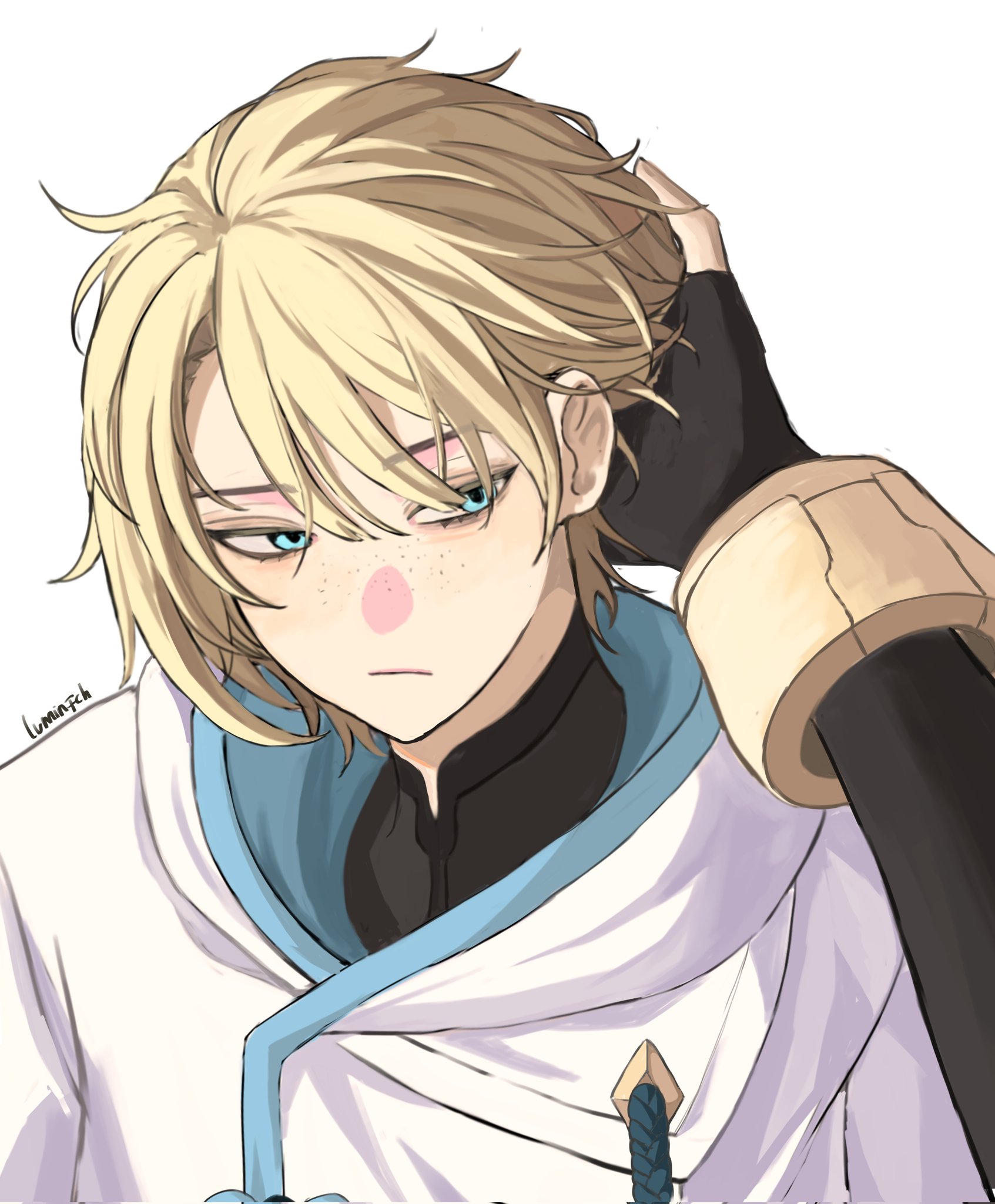 1boy armor black_gloves black_sleeves blonde_hair blue_eyes chinese_clothes chongyun_(genshin_impact) chongyun_(genshin_impact)_(cosplay) cosplay fingerless_gloves freminet_(genshin_impact) genshin_impact gloves highres long_sleeves luminfch male_focus short_hair solo white_background white_hood