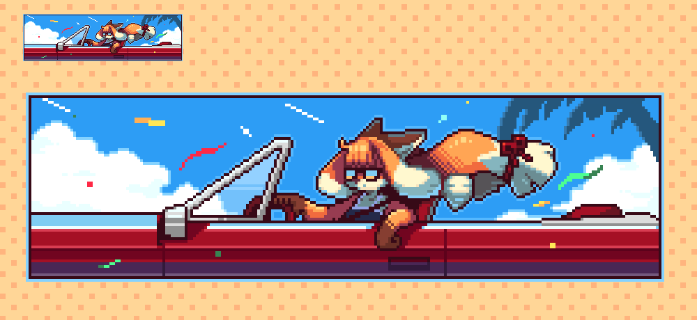 1girl animal_ears car cloud confetti convertible cumulonimbus_cloud day driving fox_ears fox_girl furry furry_female long_hair low-tied_long_hair motor_vehicle multicolored_hair omunikin orange_hair original palm_tree pixel_art solo sunglasses tree white_hair