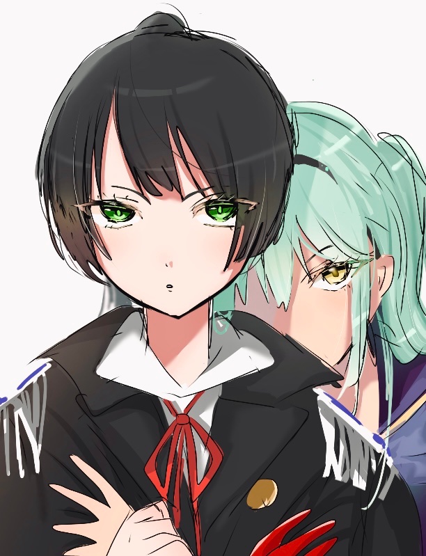 2girls arms_behind_back black_hair epaulettes fgscgwoyja32310 green_eyes green_hair heaven_burns_red kurosawa_maki long_hair multiple_girls natsume_inori neck_ribbon ponytail red_ribbon ribbon shirt sidelocks twintails white_shirt yuri