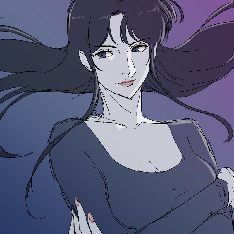 1girl blue_background bodysuit cat's_eye closed_mouth commentary crossed_arms eyelashes floating_hair kisugi_hitomi long_hair looking_to_the_side pink_lips pink_nails purple_background sidelocks smile solo upper_body yazwo