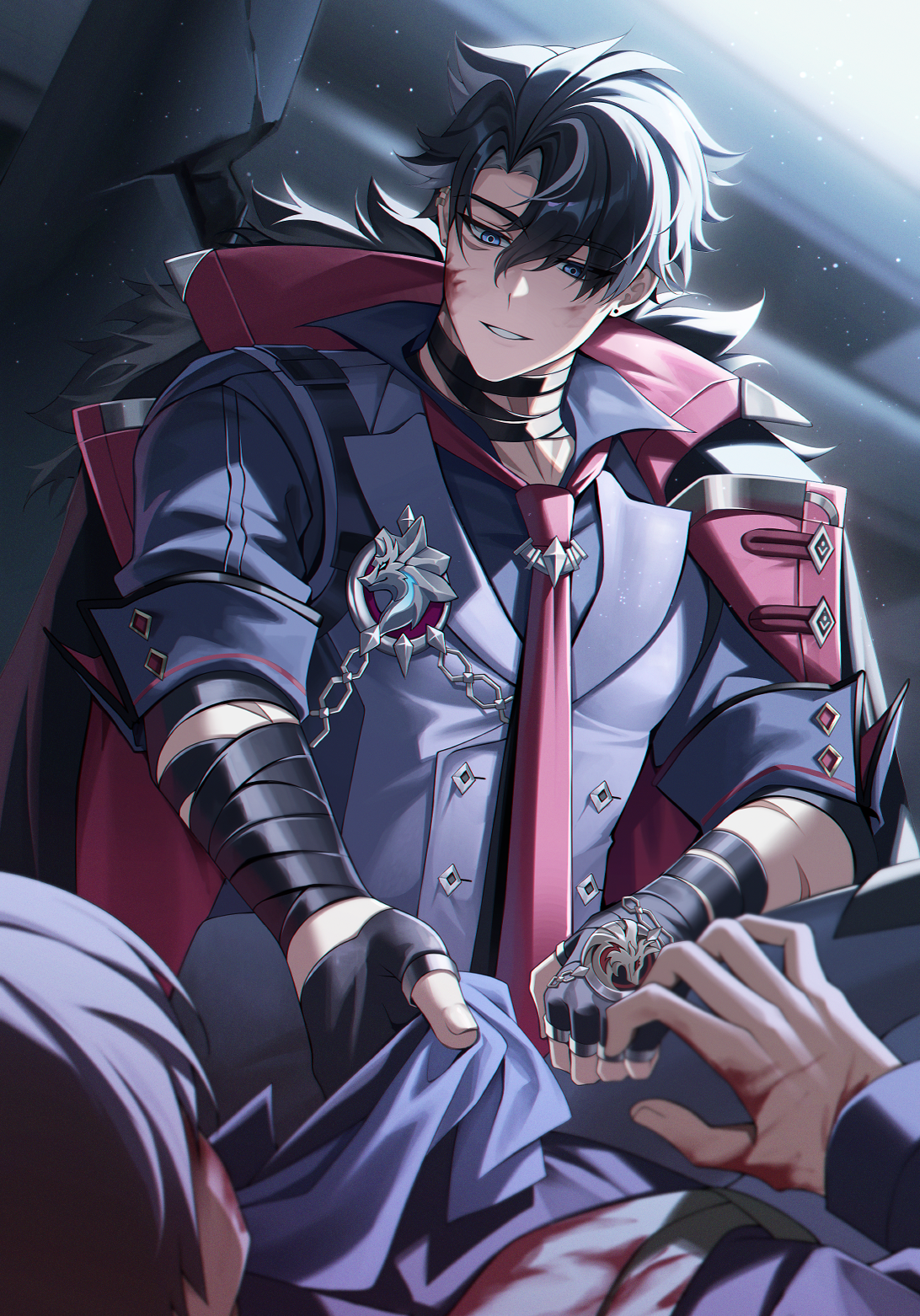 2boys bandaged_arm bandages black_bandages black_gloves black_hair black_jacket blood earrings fingerless_gloves fur-trimmed_jacket fur_trim genshin_impact gloves grey_hair hair_between_eyes highres jacket jewelry male_focus multicolored_hair multiple_boys necktie red_necktie scar short_hair smile solcha streaked_hair teeth wriothesley_(genshin_impact)