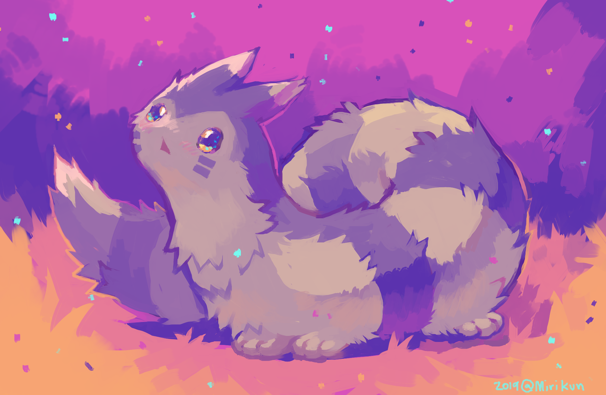 abstract_background animal_focus artist_name awestruck commentary_request confetti dated diamond_mouth ferret from_side full_body furret gen_2_pokemon hatomura_miri highres looking_afar looking_up lying nintendo no_humans on_stomach open_mouth outdoors pokemon pokemon_(creature) solo