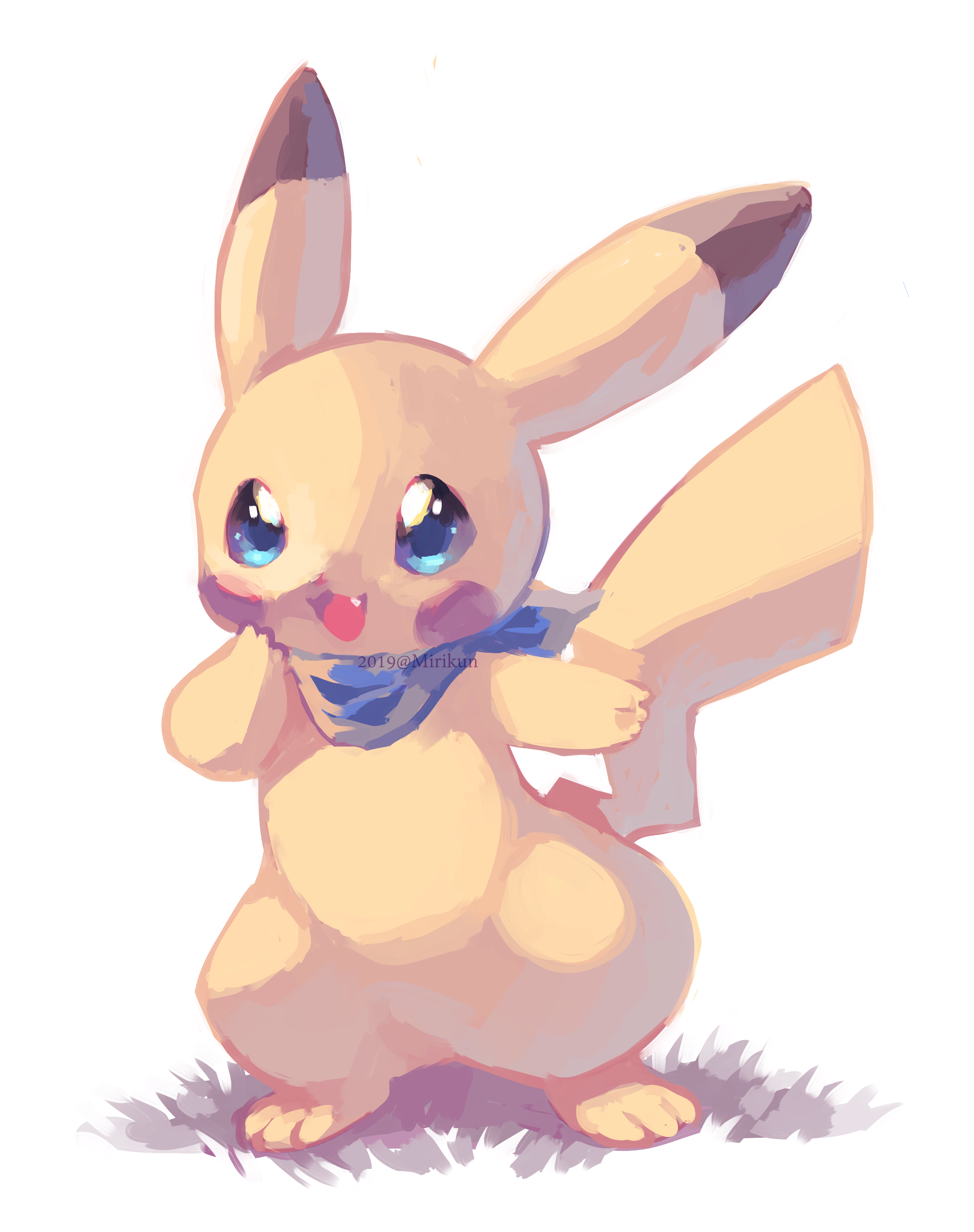 :d abstract_background absurdres animal_focus artist_name blue_eyes blue_scarf clothed_pokemon commentary dated fang full_body gen_1_pokemon grass hatomura_miri highres looking_at_viewer nintendo no_humans open_mouth pikachu pokemon pokemon_(creature) scarf simple_background smile solo standing watermark white_background