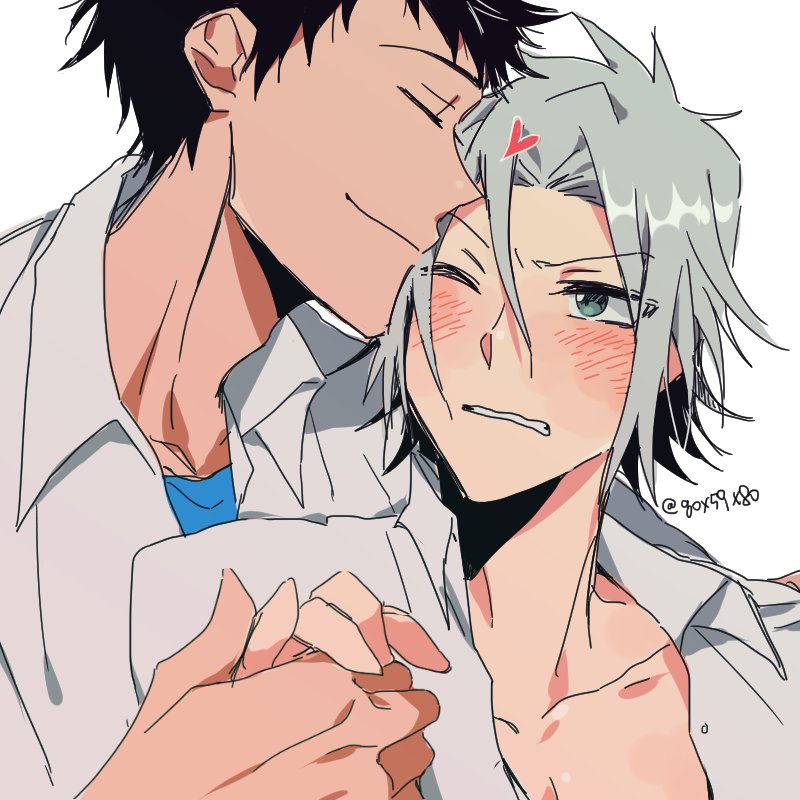 2boys 80x59x80 arm_up black_hair blue_shirt blush closed_mouth collarbone collared_shirt commentary gokudera_hayato green_eyes grey_hair hair_between_eyes heart holding_hands katekyo_hitman_reborn! looking_at_viewer male_focus multiple_boys open_clothes open_shirt parted_bangs shirt short_hair simple_background smile untranslatable_commentary teeth twitter_username unbuttoned upper_body wavy_mouth white_background white_shirt wing_collar yamamoto_takeshi yaoi