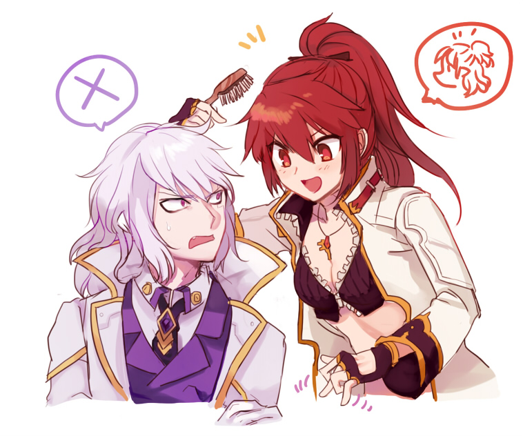 1boy 1girl :d add_(elsword) black_necktie black_wrist_cuffs blazing_heart_(elsword) breasts cleavage coat crop_top crossed_arms elesis_(elsword) elsword facial_mark fang fingerless_gloves formal_clothes frustrated gem gloves gold_trim hair_brush high_ponytail jewelry mastermind_(elsword) meshi_a necklace necktie open_clothes open_coat open_mouth pink_eyes ponytail purple_gem purple_suit red_eyes red_hair simple_background smile speech_bubble suit sweatdrop undershirt white_background white_coat white_hair wrist_cuffs x_(symbol)