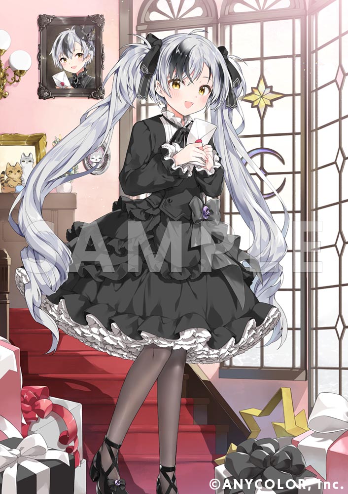 1boy 1girl :d ahoge black_dress black_footwear black_hair black_pantyhose blush box cat commentary copyright_name dress english_commentary envelope full_body genderswap genderswap_(ftm) gift gift_box grey_hair holding holding_envelope kamiyoshi_rika mixed-language_commentary multicolored_hair nijisanji official_art open_mouth pantyhose picture_frame plant potted_plant ribbon sample_watermark smile stairs standing streaked_hair suzuki_masaru suzuki_masaru_(ruko) suzuki_masaru_(stagewear) tongue twintails virtual_youtuber watermark yellow_eyes