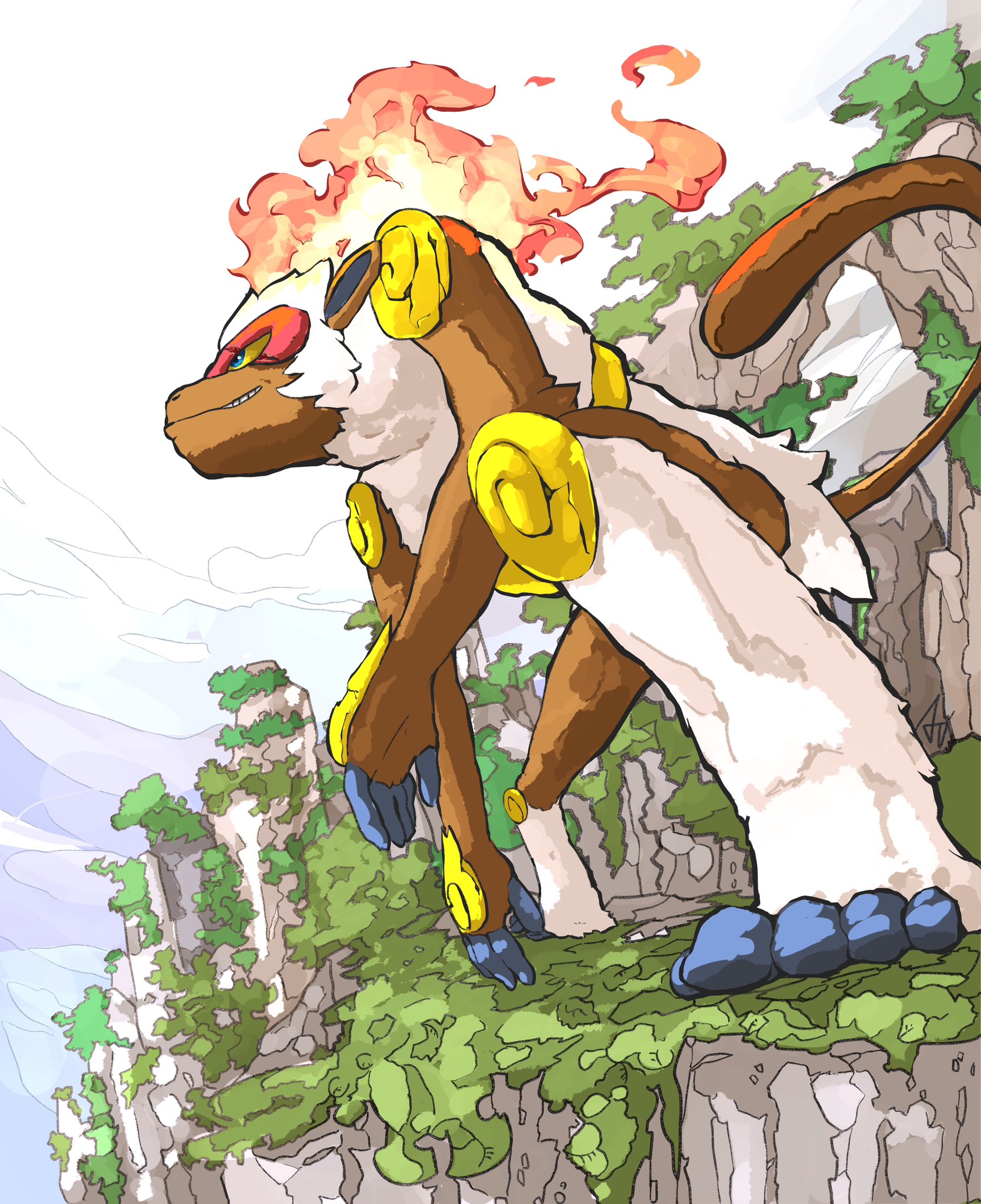 aomon_(yuuji7604) arm_on_knee blue_eyes brown_fur colored_sclera commentary english_commentary fiery_hair fire gen_4_pokemon highres infernape leaning_forward looking_ahead monkey monkey_tail mountain multicolored_fur nintendo no_humans outdoors pokemon pokemon_(creature) pokemon_focus tail white_fur yellow_sclera