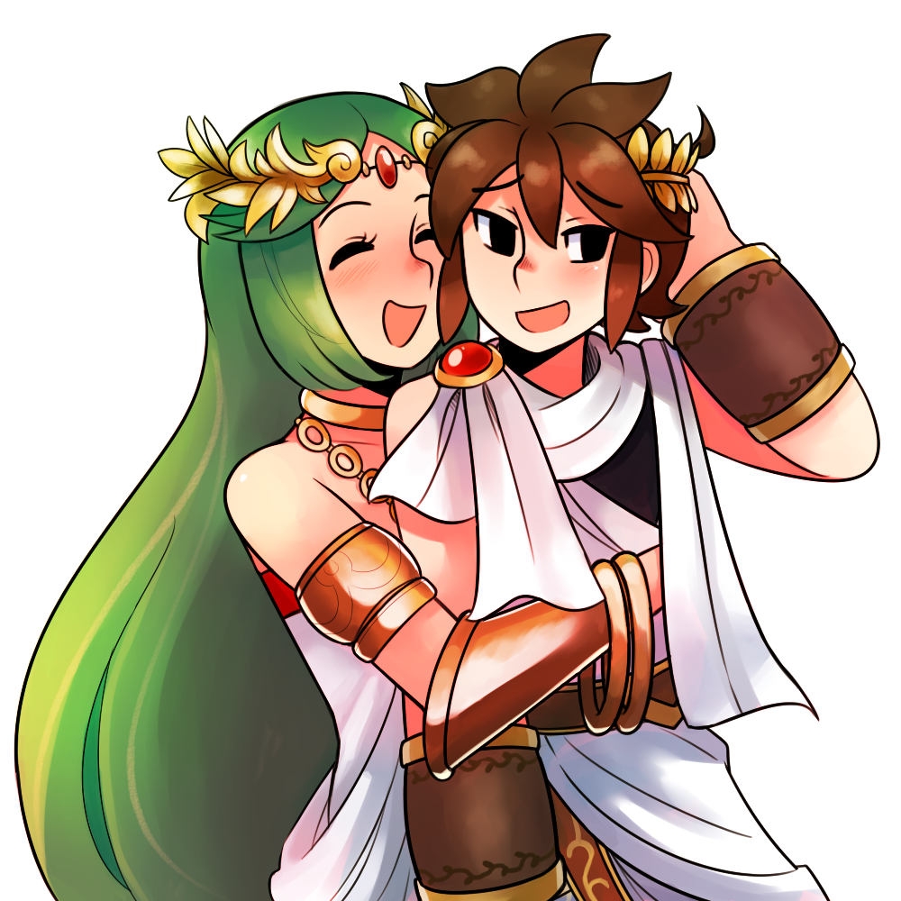 1boy 1girl ahoge arm_behind_head blush brown_hair chain closed_eyes diadem gold_chain hug kid_icarus kid_icarus_uprising laurel_crown long_hair looking_to_the_side nintendo palutena pie_(aipiepo) pit_(kid_icarus) simple_background smile very_long_hair white_background
