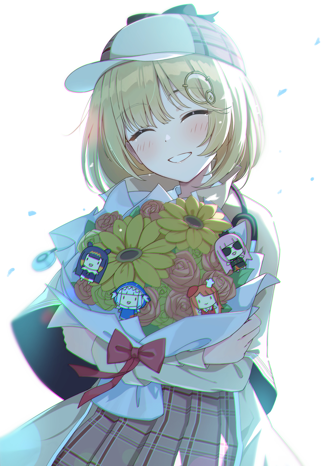 1girl ^_^ backlighting blonde_hair bouquet bow brown_hat brown_jacket brown_skirt chromatic_aberration clenched_teeth closed_eyes commentary deerstalker english_commentary flower gawr_gura hair_ornament hat highres holding holding_bouquet hololive hololive_english jacket long_sleeves mori_calliope ninomae_ina'nis plaid_clothes plaid_skirt pleated_skirt red_bow red_ribbon ribbon short_hair simple_background skirt smol_calli smol_gura smol_ina smol_kiara solo takanashi_kiara tearing_up teeth tokisaka_makoto upper_body virtual_youtuber watson_amelia watson_amelia_(1st_costume) white_background