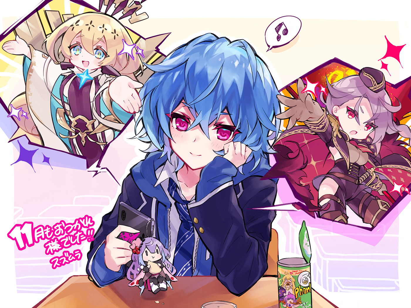 3girls ahoge almace_(phantom_of_the_kill) ancient_killers_(phantom_of_the_kill) aqua_eyes artist_name blazer blonde_hair blue_hair blue_hood blue_jacket blue_necktie braid buttons cellphone chair chibi chips_(food) classroom cloak closed_mouth commentary_request cowboy_shot crossed_bangs desk floating_cape floating_headgear food gloves grey_hair hair_between_eyes hat head_rest holding holding_phone hood hood_down hooded_jacket jacket light_blush long_sleeves looking_at_object looking_at_viewer mascot multiple_girls musical_note necktie official_alternate_costume official_art on_chair open_mouth outstretched_arm outstretched_arms phantom_of_the_kill phone pink_eyes potato_chips ragnarok_(phantom_of_the_kill) red_cloak red_eyes red_necktie school_chair school_desk school_uniform second-party_source shirt short_hair sitting smartphone speech_bubble spoken_character spoken_musical_note straight-on suzumura_(gumi) tiphereth_(phantom_of_the_kill) titania_(phantom_of_the_kill) two-sided_cloak two-sided_fabric upper_body white_shirt