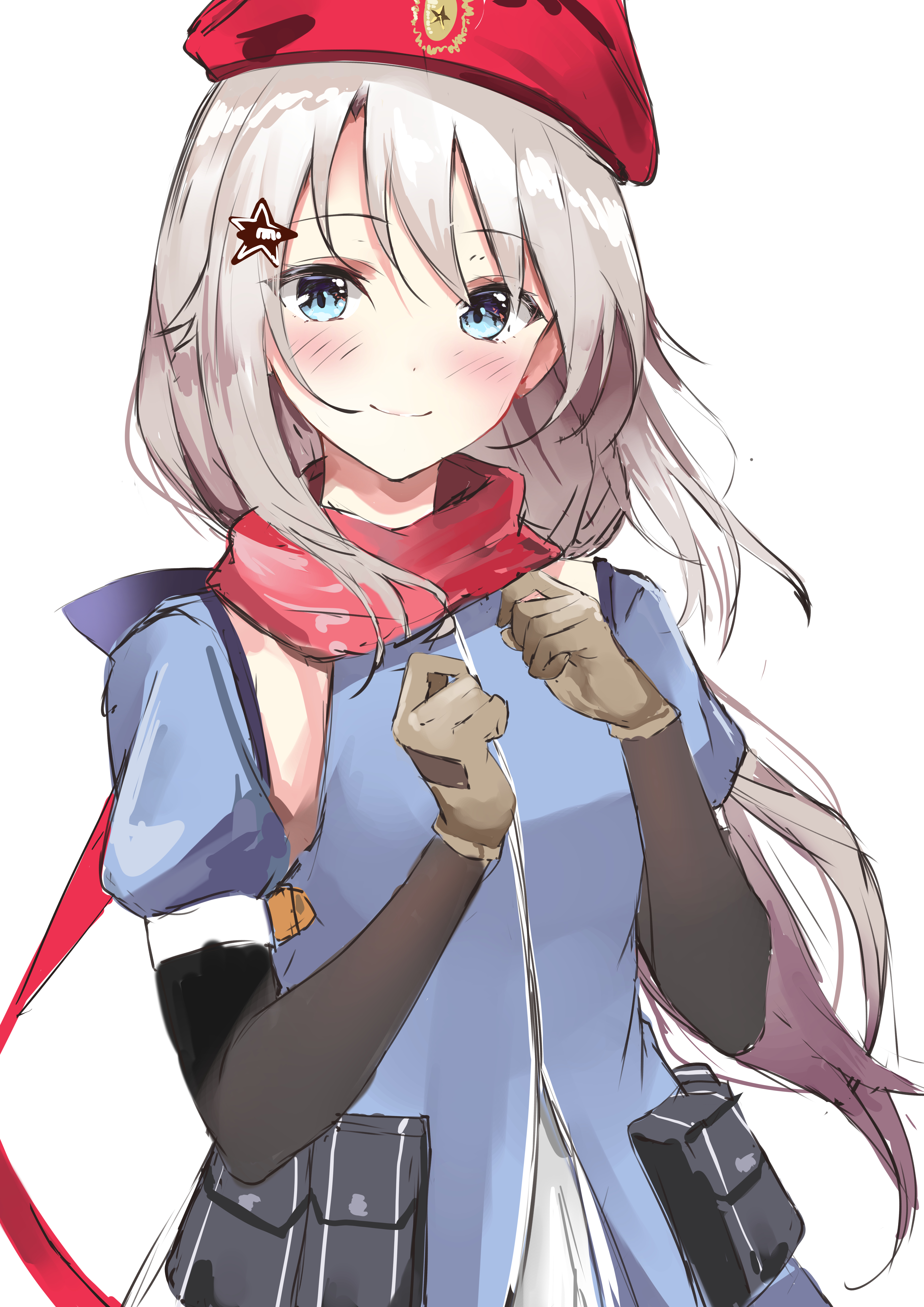 1girl 9a-91_(girls'_frontline) absurdres aizawa_(aizawatsu) beret blue_eyes blush commentary girls'_frontline gloves grey_hair hair_ornament hat highres light_smile looking_at_viewer red_hat simple_background solo star_(symbol) star_hair_ornament white_background