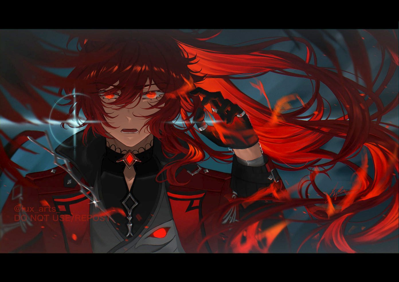 1boy black_gloves coat diluc_(genshin_impact) diluc_(red_dead_of_night)_(genshin_impact) genshin_impact gloves glowing glowing_eyes hair_between_eyes letterboxed long_hair long_sleeves lux_arts male_focus official_alternate_costume open_mouth red_coat red_eyes red_hair solo