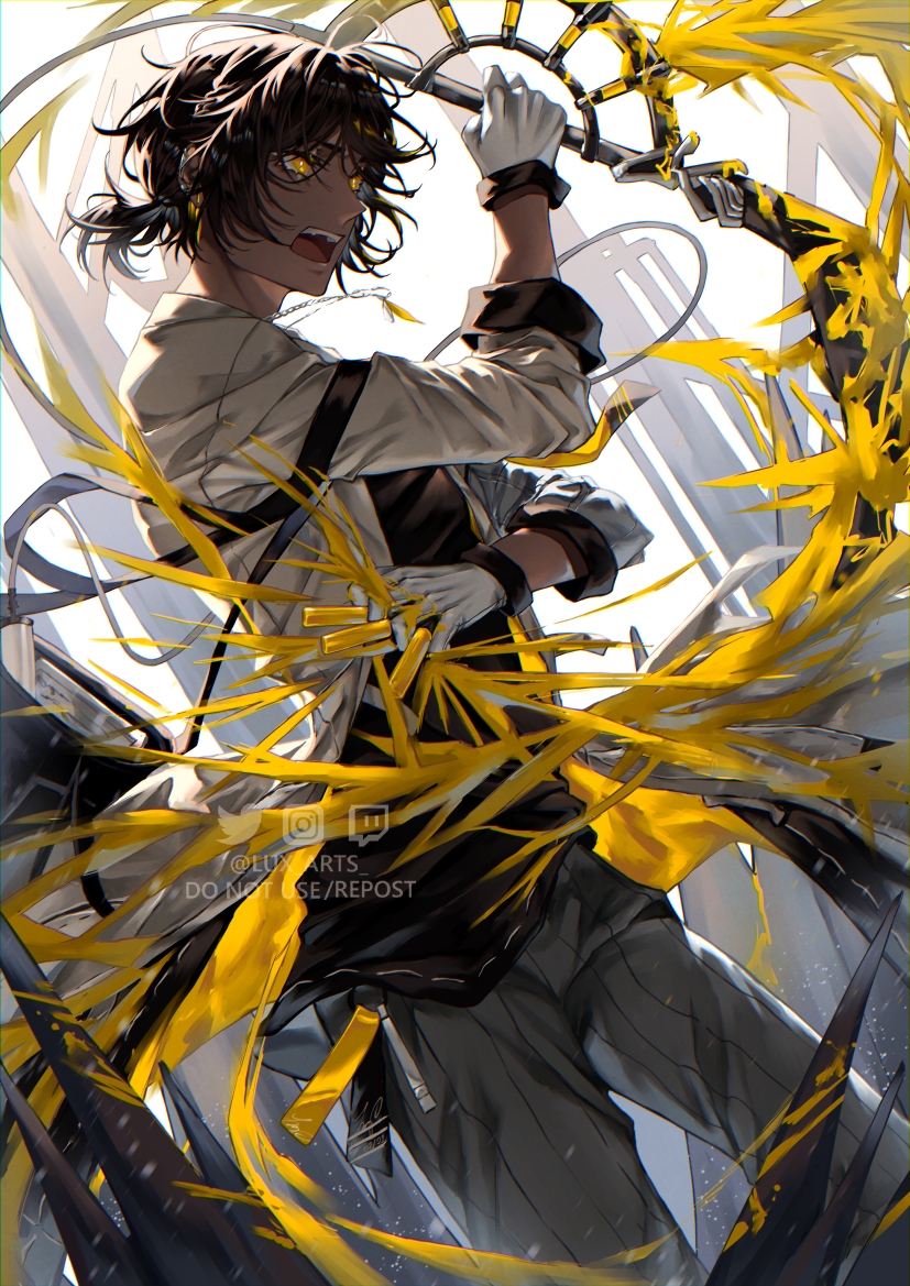 1boy arknights black_hair black_shirt dark-skinned_male dark_skin gloves holding jacket jewelry long_sleeves lux_arts male_focus necklace open_mouth shirt short_hair solo thorns_(arknights) white_gloves yellow_eyes