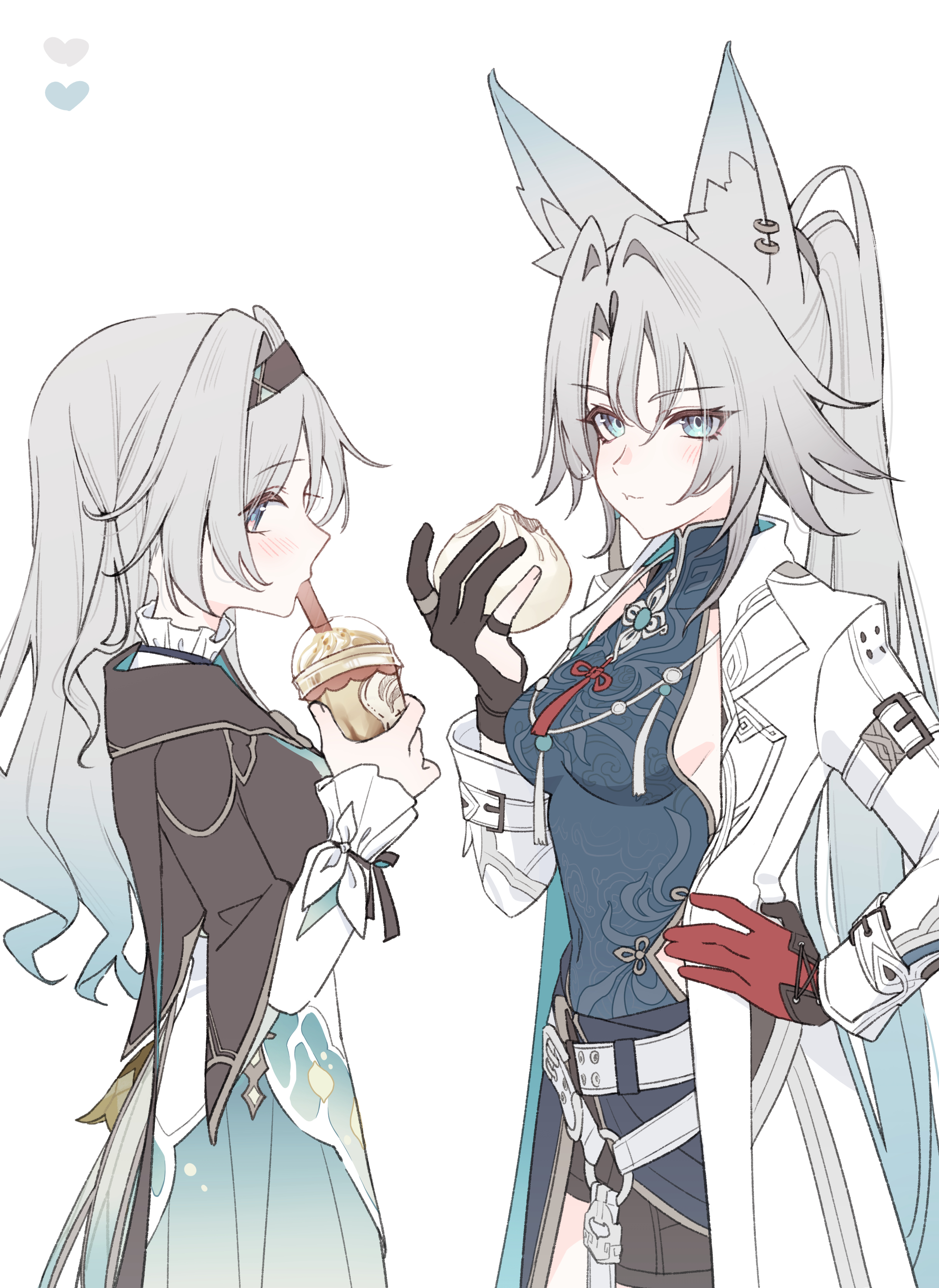 2girls absurdres animal_ears belt black_gloves black_hairband black_jacket black_shorts blue_eyes blue_shirt blush breasts clothes_around_waist coat commentary_request covered_navel cowboy_shot cup disposable_cup drinking drinking_straw drinking_straw_in_mouth eating feixiao_(honkai:_star_rail) firefly_(honkai:_star_rail) food fox_ears fox_girl frilled_shirt_collar frills from_side gloves gradient_hair green_hair green_skirt hairband heart highres holding holding_cup holding_food honkai:_star_rail honkai_(series) jacket large_breasts long_sleeves looking_at_viewer multicolored_hair multiple_girls parted_bangs partial_commentary ponytail ruru_amachi shirt shorts sidelocks simple_background skirt standing white_background white_belt white_coat white_hair white_shirt