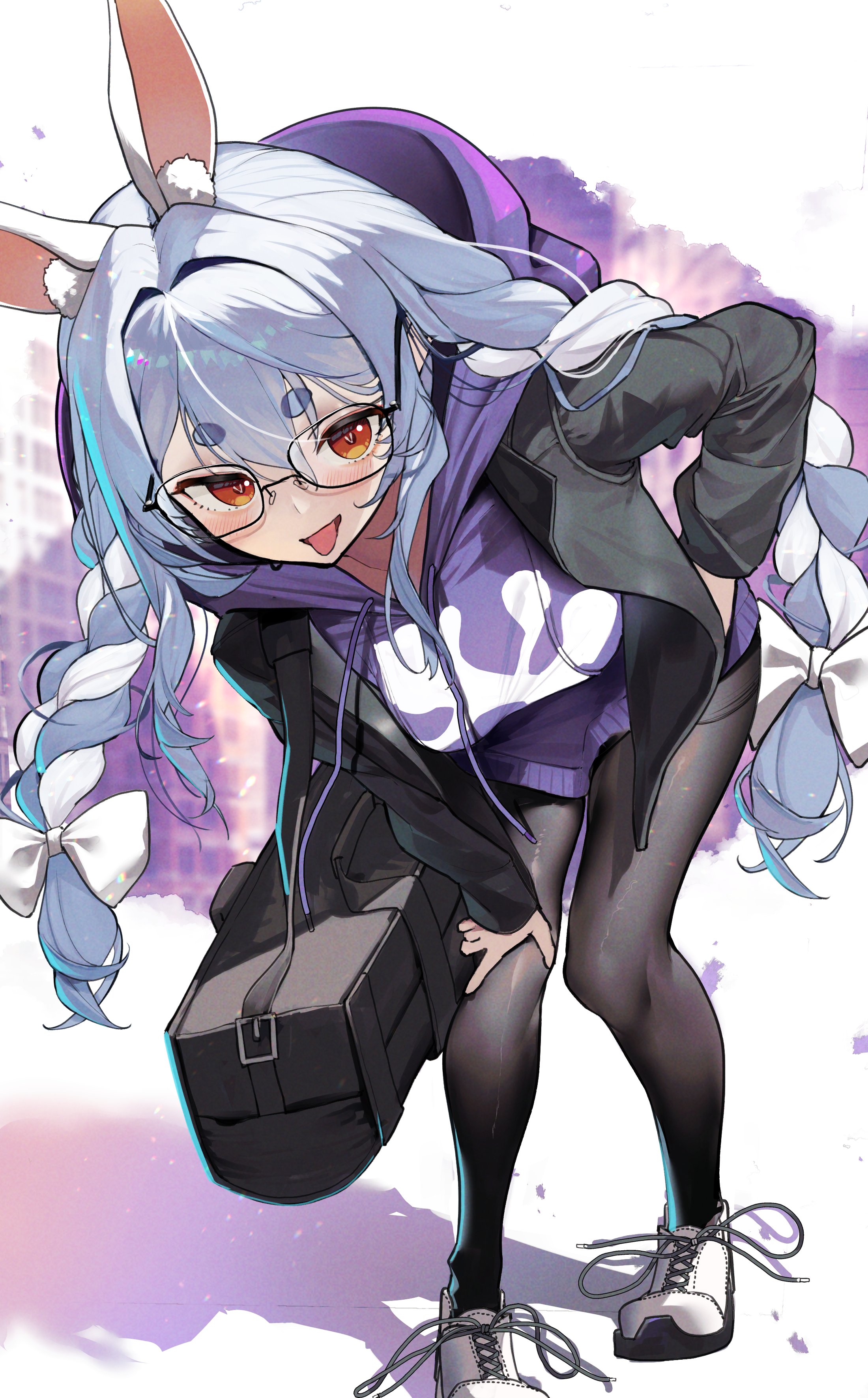 1girl absurdres animal_ears black_bag black_jacket black_pantyhose blue_hair braid glasses hand_on_own_hip hand_on_own_knee haruhina_purple highres hololive hood hoodie jacket long_hair looking_at_viewer open_clothes open_jacket open_mouth pantyhose rabbit_ears red_eyes shadow shoes simple_background solo thick_eyebrows tongue tongue_out twin_braids usada_pekora virtual_youtuber white_shoes