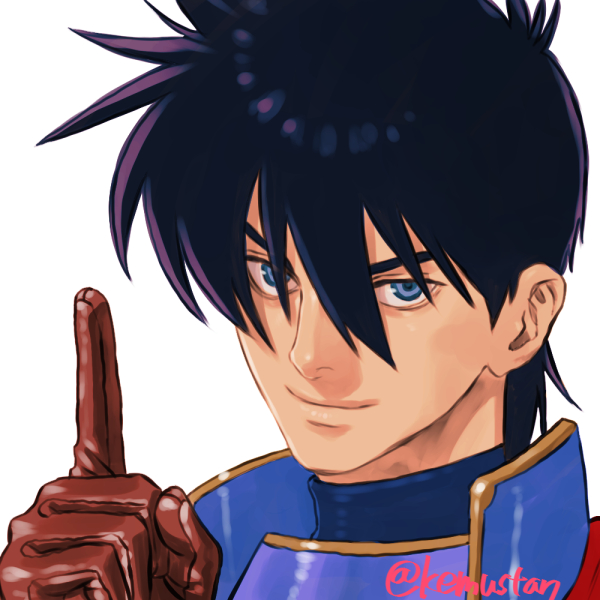 1980s_(style) 1boy armor black_hair blue_eyes close-up dragon_quest dragon_quest_i gloves hair_between_eyes hero_(dq1) index_finger_raised looking_at_viewer male_focus oldschool simple_background smile solo sonomoto_shinzou_(natsume_kyouji) upper_body white_background