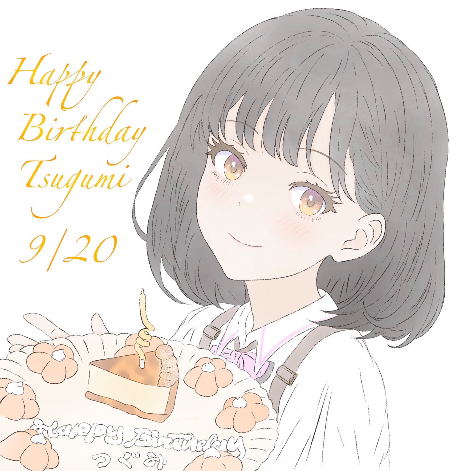 1girl assault_lily birthday_cake black_hair blush bow bowtie cake cake_slice character_name closed_mouth collared_shirt commentary_request food hair_behind_ear hand_up happy_birthday hasegawa_gabriella_tsugumi highres holding holding_plate looking_at_viewer ludvico_private_girls'_academy_school_uniform medium_hair pickles_(picpicpickles) pink_bow pink_bowtie plate school_uniform shirt simple_background solo suspenders upper_body white_background white_shirt yellow_eyes