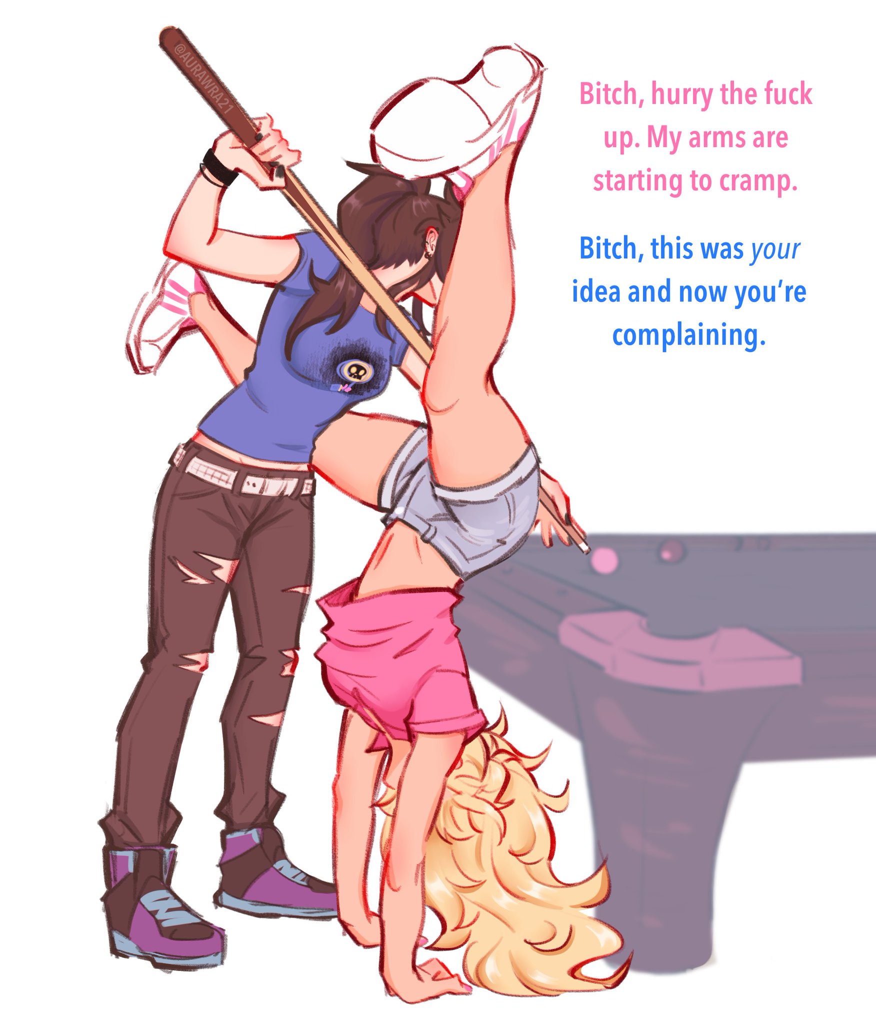 2girls aurora_(aurawra21) black_hair black_nails blonde_hair blue_shirt bracelet class_of_09 collared_shirt cue_stick english_text handstand highres jecka_(class_of_09) jewelry multiple_girls navel nicole_(class_of_09) pants pink_shirt ponytail pool_table purple_footwear shirt short_shorts shorts simple_background table tan torn_clothes torn_pants white_background