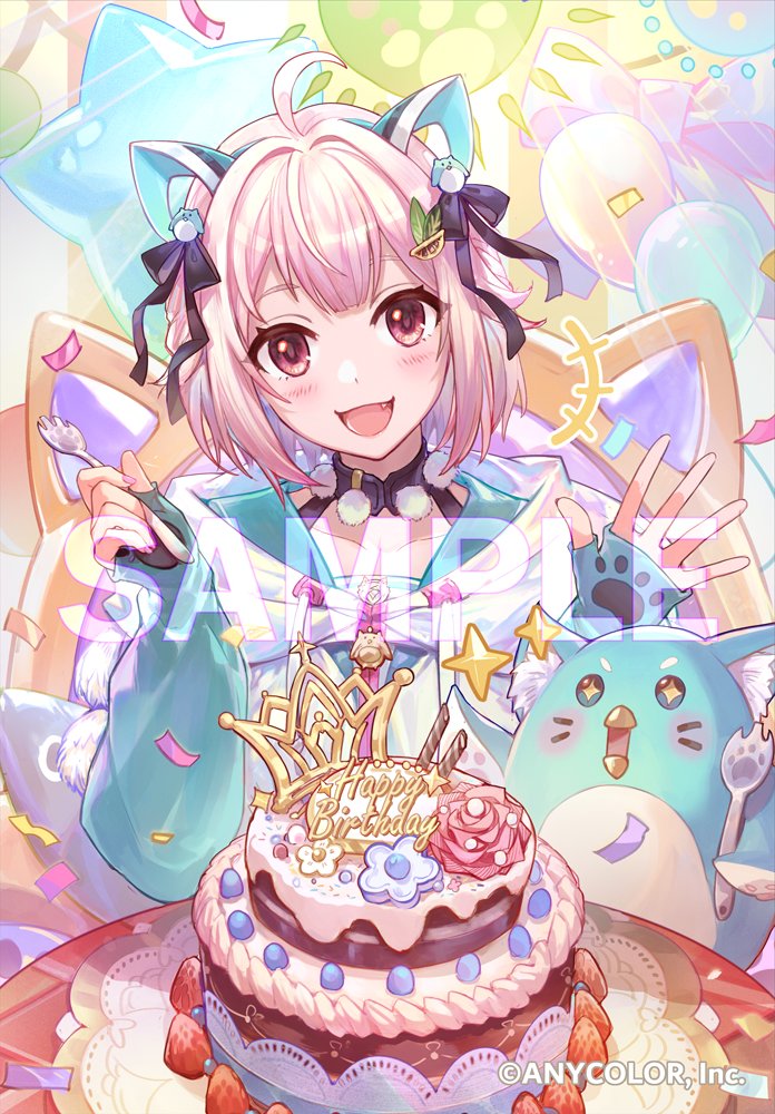 1girl :d ahoge animal_ears blue_sleeves blush cake cat_ears confetti copyright_name csyday detached_sleeves english_text fake_animal_ears fang food food-themed_hair_ornament fork hair_intakes hair_ornament happy_birthday hayama_marin hayama_marin_(1st_costume) head_tilt holding holding_fork lime_hair_ornament nijisanji official_art open_mouth pink_eyes sample_watermark sitting smile solo star_balloon tongue virtual_youtuber watermark white_hair