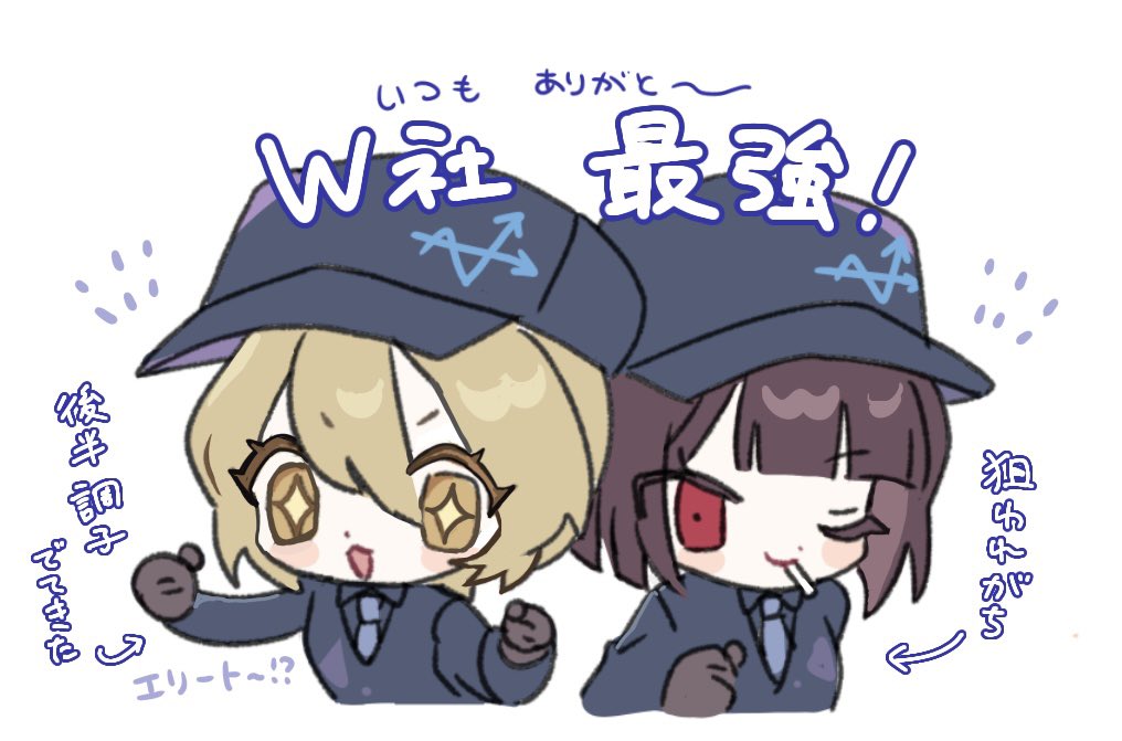 2girls 9_wapuwapu :3 baseball_cap black_gloves black_hair black_shirt blonde_hair blue_hat blue_necktie chibi clenched_hands collared_shirt don_quixote_(project_moon) gloves hat limbus_company multiple_girls necktie one_eye_closed open_mouth project_moon red_eyes ryoshu_(project_moon) shirt short_hair simple_background smile sparkling_eyes translation_request upper_body w_corp._(identity)_(project_moon) white_background yellow_eyes