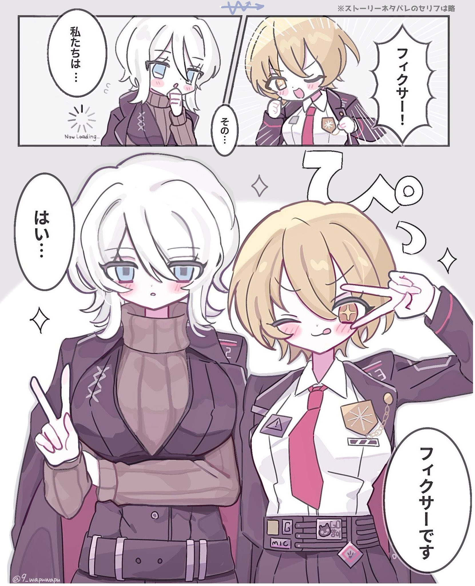 2girls 9_wapuwapu :q arm_up badge black_coat black_pants black_vest blonde_hair breasts brown_sweater closed_mouth coat coat_on_shoulders collared_shirt commentary_request don_quixote_(project_moon) faust_(project_moon) highres lapels large_breasts limbus_company looking_at_viewer multiple_girls necktie notched_lapels open_mouth pants partially_translated project_moon red_necktie ribbed_sweater shirt short_hair smile speech_bubble sweater tongue tongue_out translation_request turtleneck turtleneck_sweater v v_over_eye vest white_shirt yellow_eyes