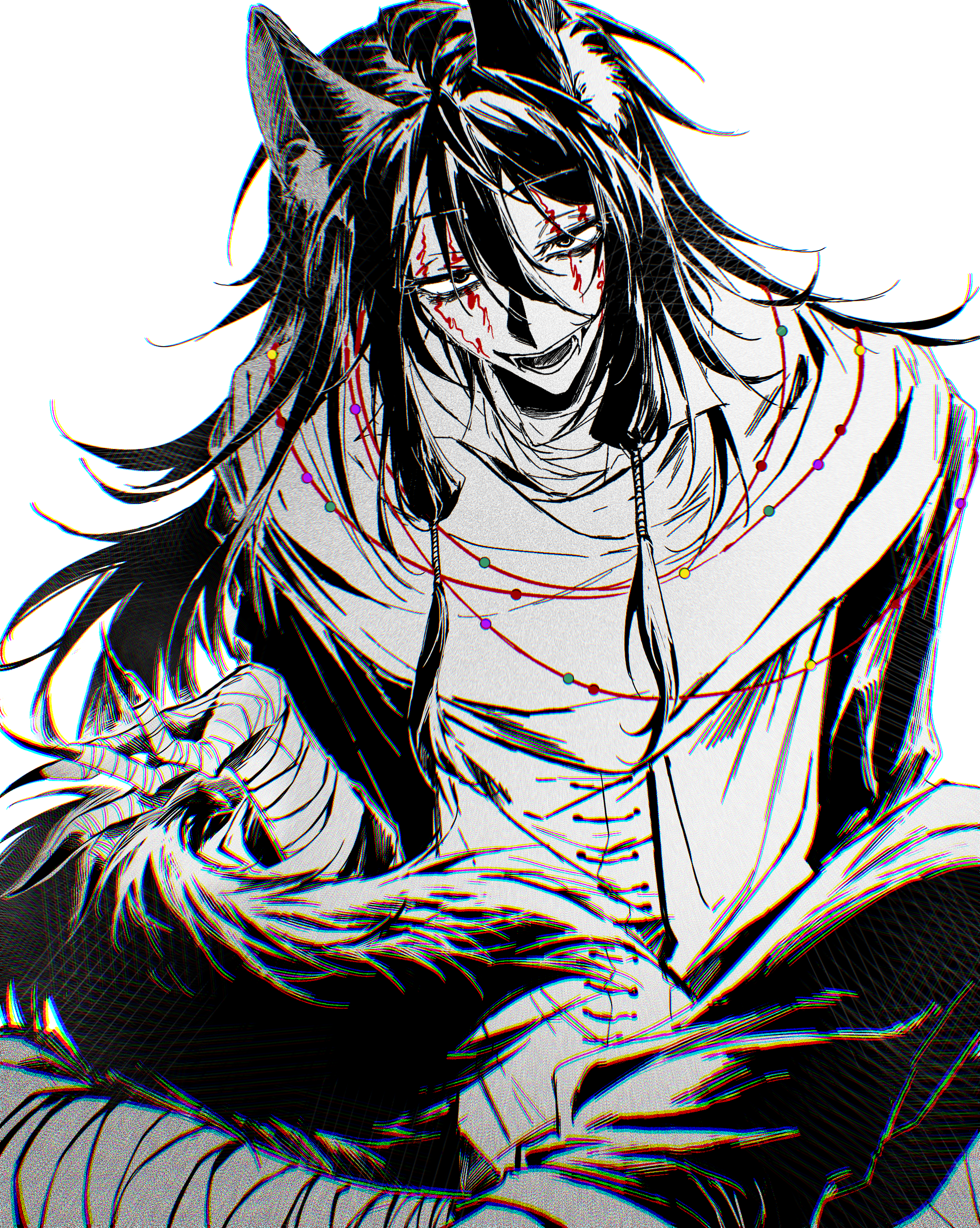 1boy absurdres animal_ears bandaged_hand bandages cat_boy cat_ears cat_tail chinese_commentary chromatic_aberration claws commentary_request facial_tattoo fangs film_grain greyscale hair_between_eyes hand_up highres long_bangs long_hair male_focus mole mole_under_eye monochrome open_mouth pants scarf shirt shiyu_sandu simple_background sitting smile solo spot_color tail tattoo touqi_guaitan white_background ziche_fuzhao