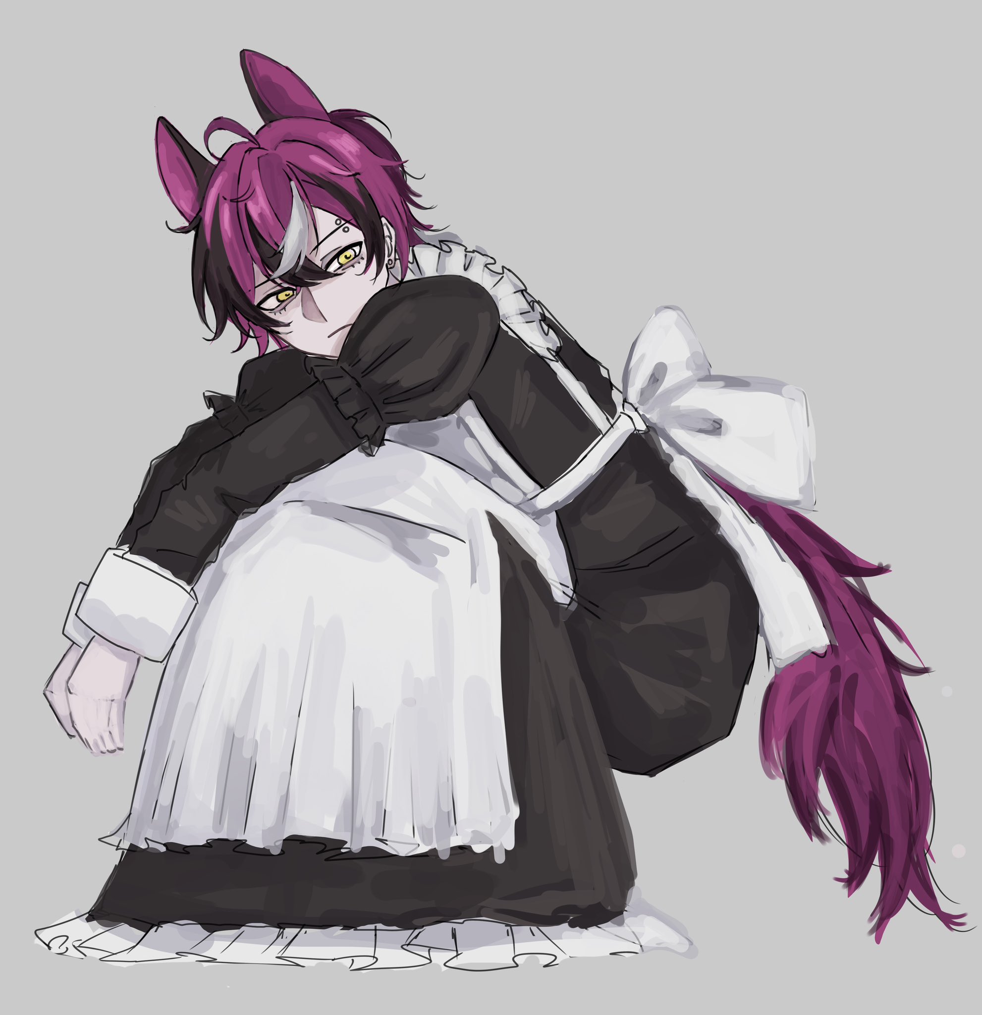 1boy agg_agg animal_ears apron back_bow black_dress bow commentary crossdressing crossdressing_(mtf) doppio_dropscythe dress eyebrow_piercing face_piercing frilled_dress frills grey_background hashtag-only_commentary highres juliet_sleeves kemonomimi_mode kneeling long_sleeves looking_to_the_side maid male_focus male_maid multicolored_hair nijisanji nijisanji_en piercing puffy_sleeves purple_hair sideways_glance simple_background sleeve_cuffs streaked_hair tail virtual_youtuber white_bow yellow_eyes