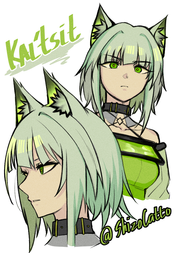 1girl animal_ear_fluff arknights bare_shoulders bright_pupils character_name closed_mouth cropped_torso dress green_dress green_eyes green_hair halterneck kal'tsit_(arknights) looking_at_viewer medium_hair multiple_views off_shoulder parted_lips pixiv_username profile shizocatto simple_background white_background white_pupils